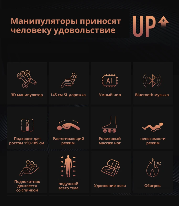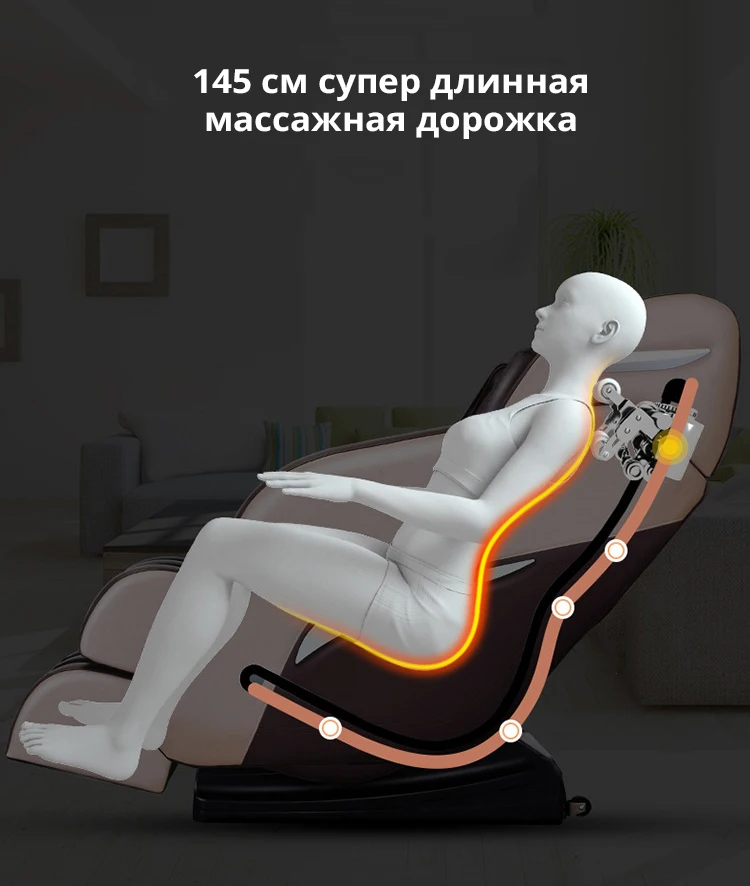 * 3D манипулятор * 145 см SL трек * Смарт-чип * При прослушивании музыки по Bluetooth * Подходит для 150-185 см * Растяжения режим • Ножной роликовый массаж * Массажное кресло с эффектом "нулевой гравитации * Тяга стеклоочистителя * Надувная подушка безопасности * Для растяжки ног * Отопление