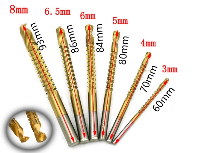 100% brand new and high quality. Suitable for thin wood, plastic plates pull grooving. Color: as picture shows Material: HSS 4241 Drill Bit Surface treatment: Titanium Coated Size: 3mm, 4mm, 5mm, 6mm, 6.5mm, 8mm Package included:6pcs x Drill Bit