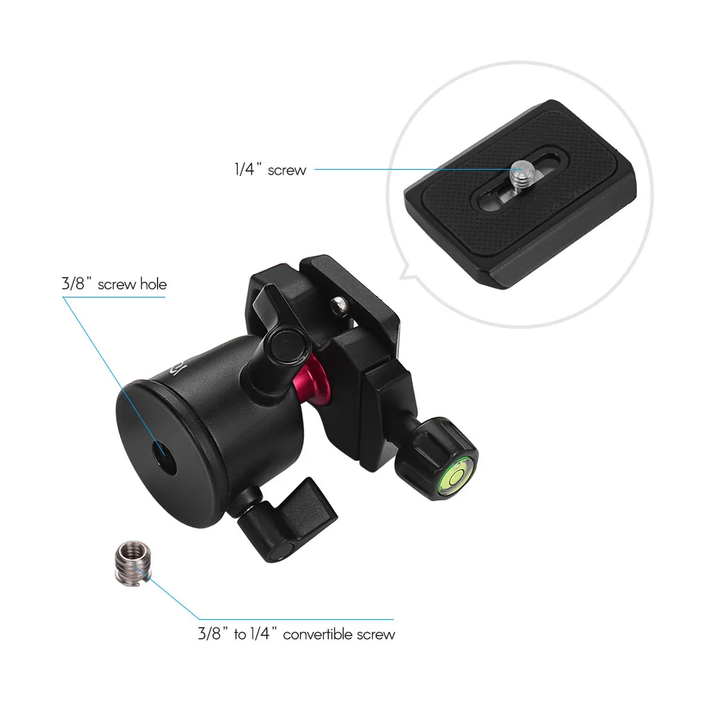 Гибкий шаровая Головка:С быстроразъемной пластиной, легко устанавливается и снимается; Вращение на 360 ° для панорамной съемки; Встроенный уровень пузырьков, вы можете легко найти лучший угол съемки.