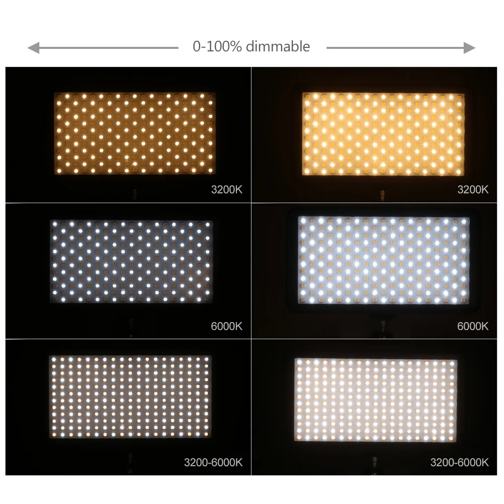 3200K-6000K Цветовая температура, 0-100% затемнения.