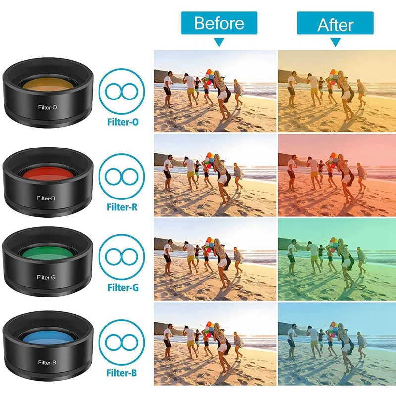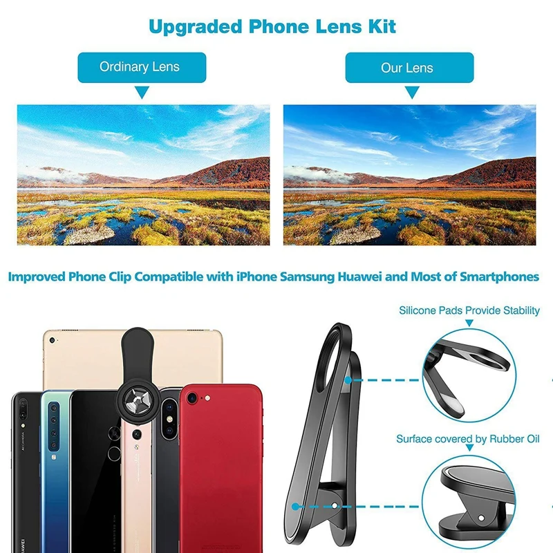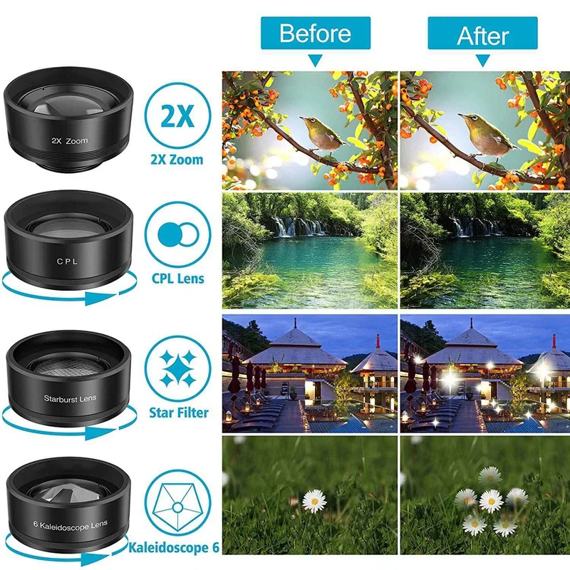 Широкоугольный объектив для захвата более широкой сцены; Макро-линзы для обеспечения интенсивных и тщательных деталей предметов, линзы «рыбий глаз» для забавного кругового обзора мира; фильтр для объектива CPL, рассеянный светильник, уменьшает отражение, линза калейдоскопа показывает пересекающееся видение.