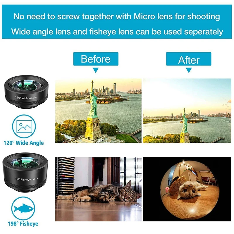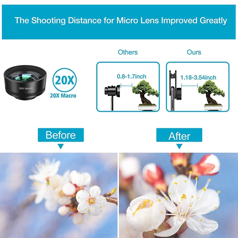 Не как у других широкоугольных и макро-линз, необходимо вкрутить один на другой для съемки, широкий угол 0,36x и макро-объектив 20X имеют новейший дизайн, который может использоваться отдельно, И расстояние до объекта съемки для макро-объектив 1,18-3,54 дюймов (гораздо лучше, чем у других).