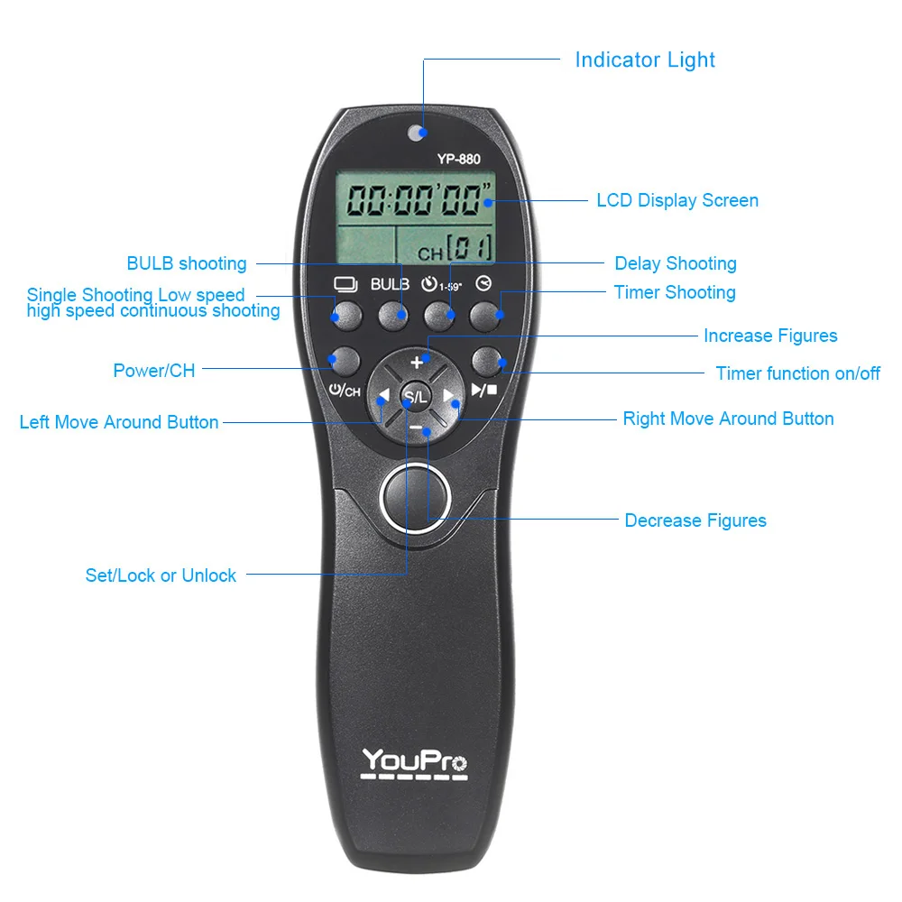 YouPro YP-880 камера проводной спуск затвора Дистанционное Управление поддерживает одиночную съемку, низкую скорость и высокоскоростную непрерывную съемку, лампу съемки, задержку съемки и временную съемку, может удовлетворить ваши различные требования к съемке.