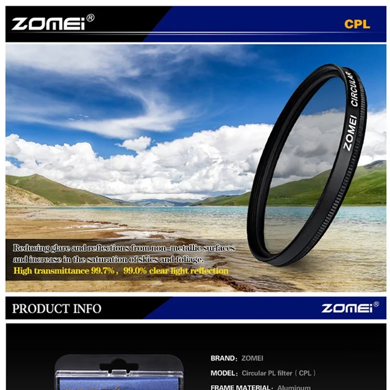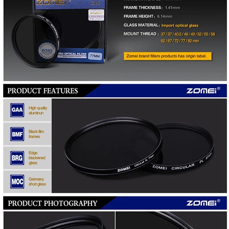 Скорость поляризации до 99.9% и коэффициент пропускания до 99.7%. Сделано без компромиссов. Стекло, установленное по технологии пресса высокого давления. Оригинальное Оптическое стекло AGC из Японии. Все материалы, используемые в этом фильтре, соответствуют требованиям стандартов Европейского союза по защите окружающей среды-ROHS (ограничения на опасные вещества). Светильник, отражающийся на любой поверхности, может стать поляризованным, поэтому поляризационные фильтры используются для выбора, какой светильник входит в объектив камеры.Смотрите так же другие товары: