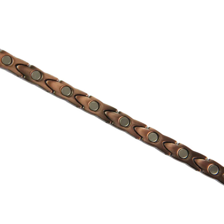 MagEnergy женский медный браслет мощные браслеты для магнитотерапии регулируемый размер Артикул: CB006 Материал: 99.9% Чистая медь Размер: ширина 7 мм, толщина 3,2 мм Длина 22 см, которая может регулировать размер по инструменту Отделка: щетка Цвет: винтажный медный цвет Элемент здоровья: 3000 Гаусс Неодимовый Магнит