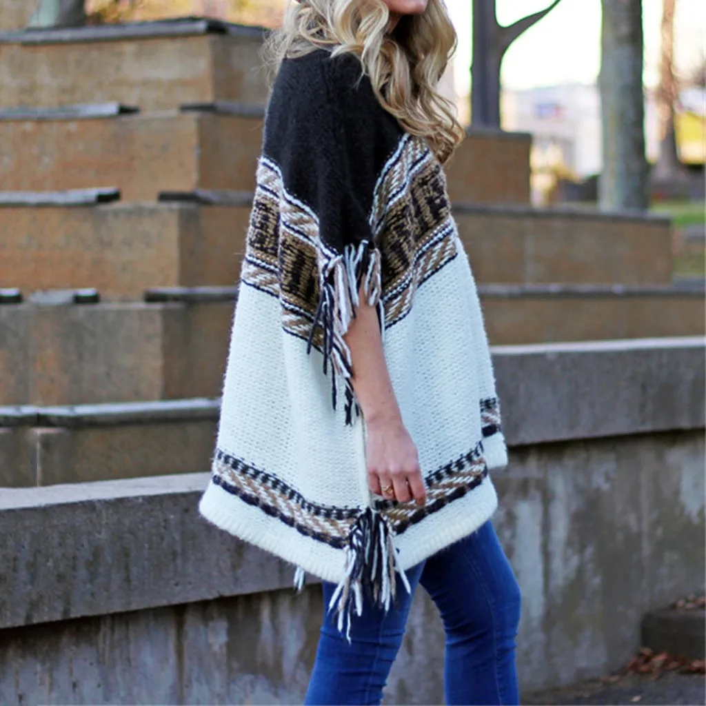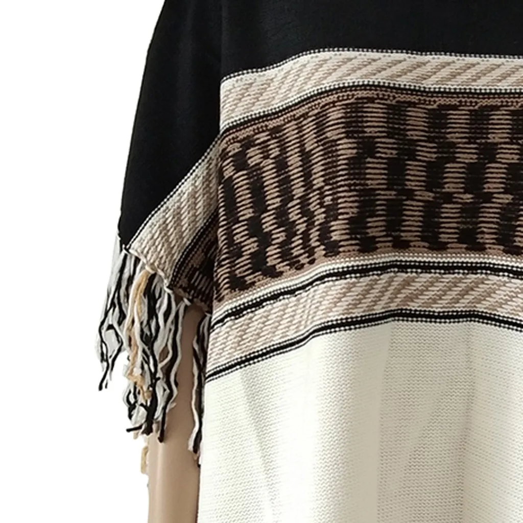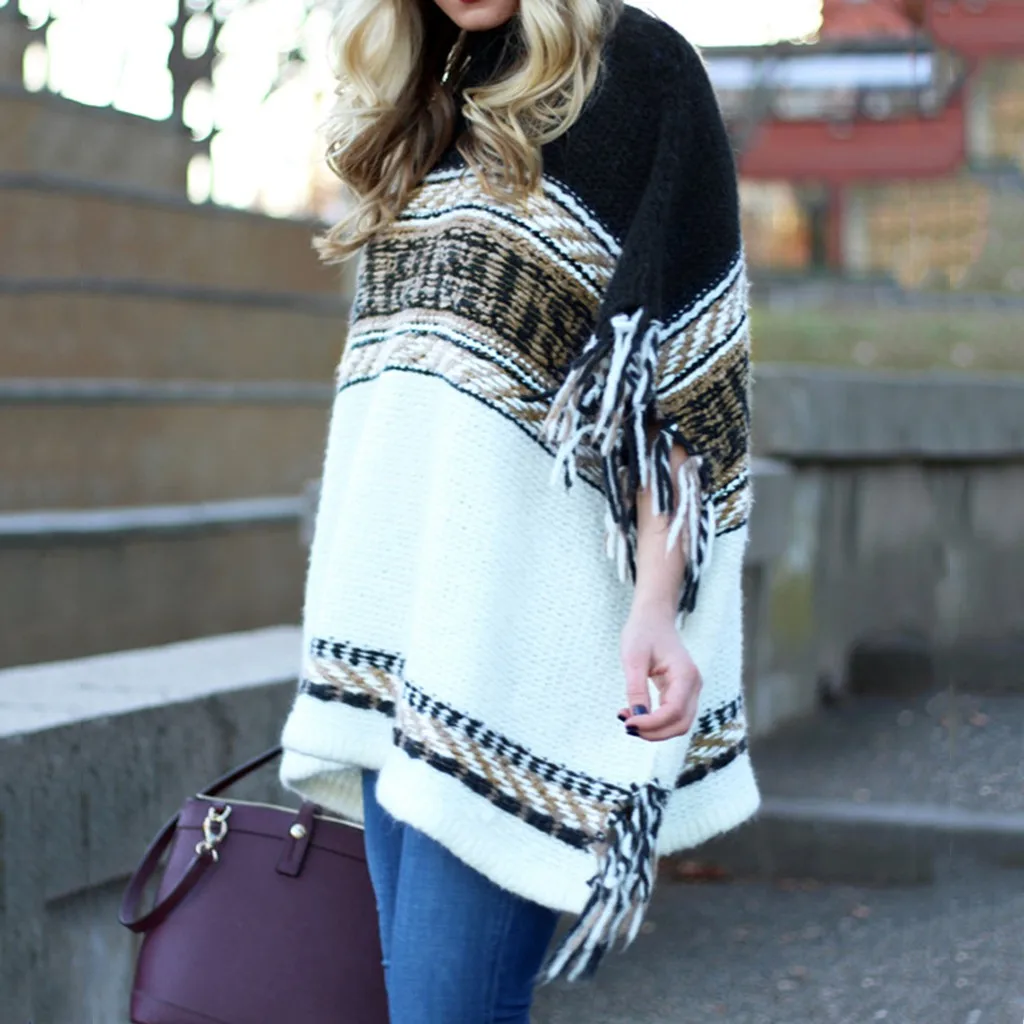 JAYCOSIN Winter Sweater Women O-Neck Knitted Cloak Pullover Feminino Casual O-Neck Stripe Block Tassel Long Sleeve Sweater 823