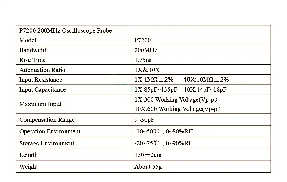 Регулируемый зонд осциллографа, который совместим с интерфейсом BNC, цифровыми осциллографами, виртуальными осциллографами, ручными осциллографами и т. д. Модель: P7200 Коэффициент ослабления: X1/X10 Полоса пропускания: 200 МГц Время подъема: 1,75 нс Входное сопротивление: 1 МОм/10 МОм +-2% Входная емкость: 1X:85pF ~ 120pF 10X:18.5pF ~ 22.5pF Диапазон компенсации: 10 пФ ~ 35 ПФ Диапазон рабочих температур: - 10 ℃ ~ + 55 ℃ Не рабочий диапазон температур: - 20 ℃ ~ + 60 ℃ Процесс: Интеграция литья под давлением Цвет: черный Длина кабеля: 142 см/55,9 дюйма Влажность: ≤ 85% (относительная влажность) Вес: 118 г