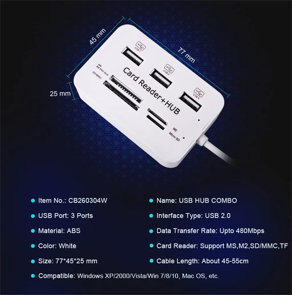 Высокая Скорость USB 2,0 концентратор 3 порта с кардридером мини концентратор USB комбо все в одном