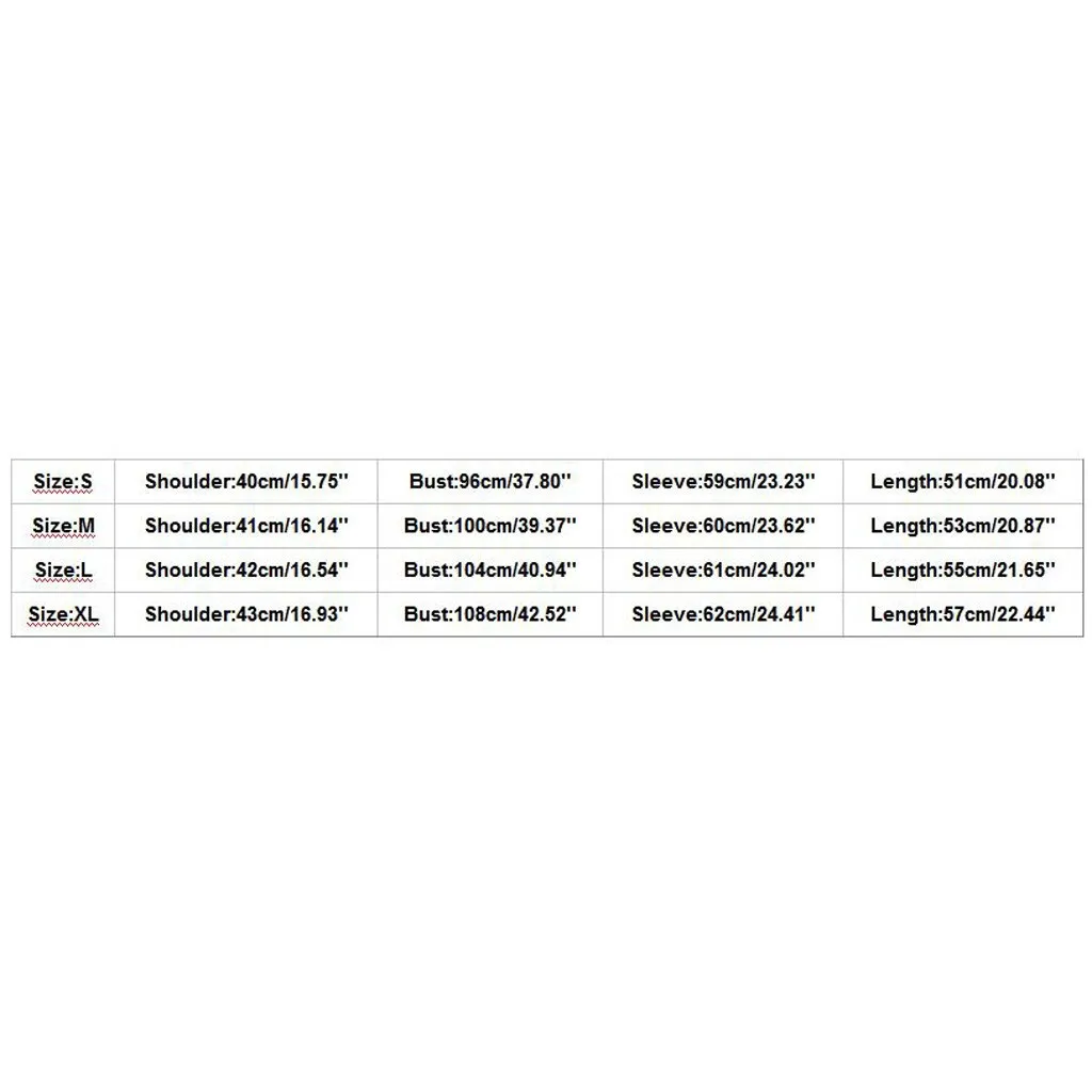 | Размеры: L | Плечо: 42 см/16,54 дюйма | Бюст: 104 см/40,94 дюйма | Рукав: 61 см/24,02 дюйма | Длина: 55 см/21,65 дюйма |