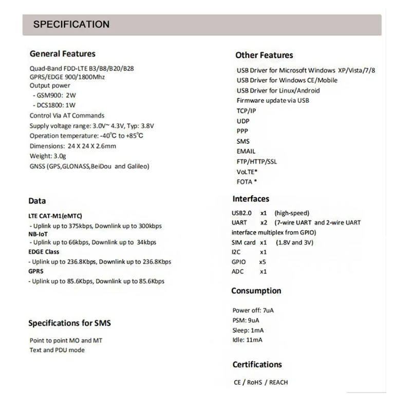 Интерфейсы: Расход Сертификаты Основные преимущества: SIM7000E обеспечивает более глубокое расширение покрытия Пакет и команды SIM7000E