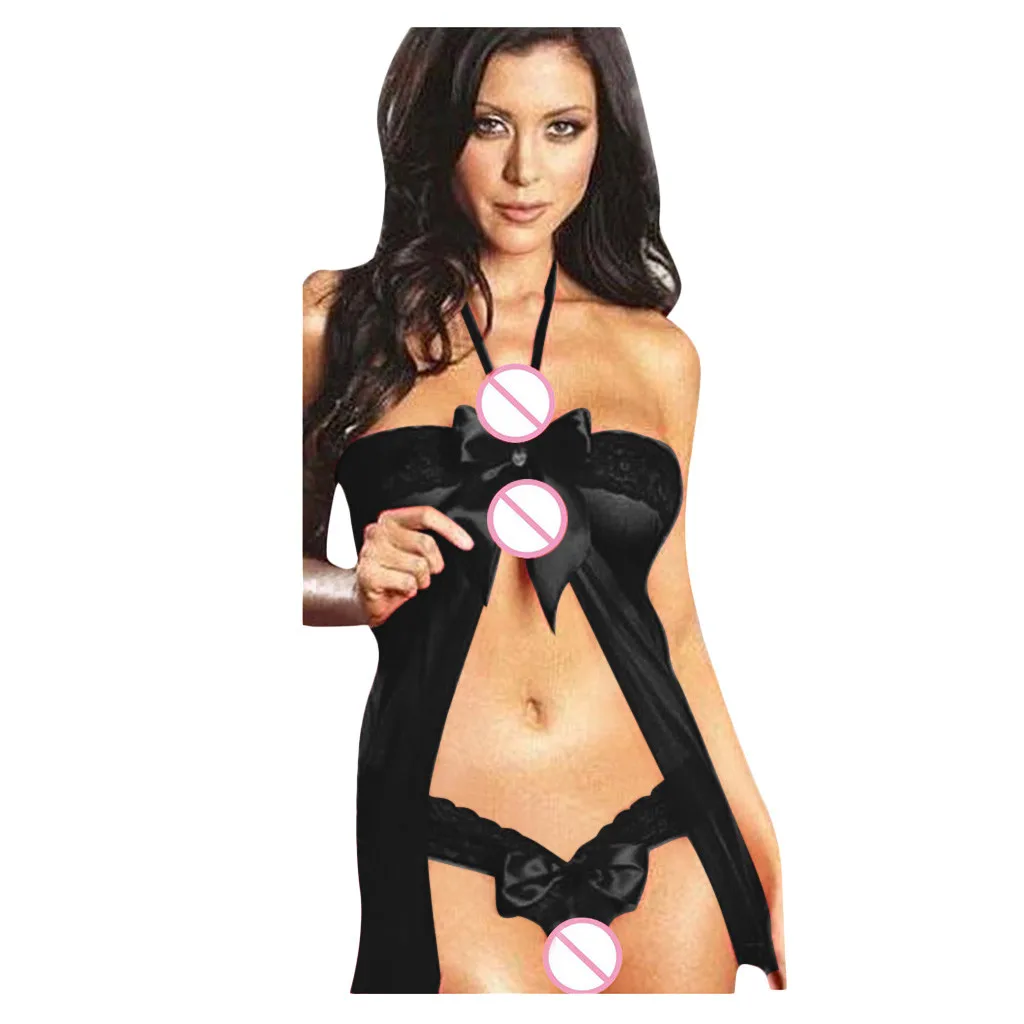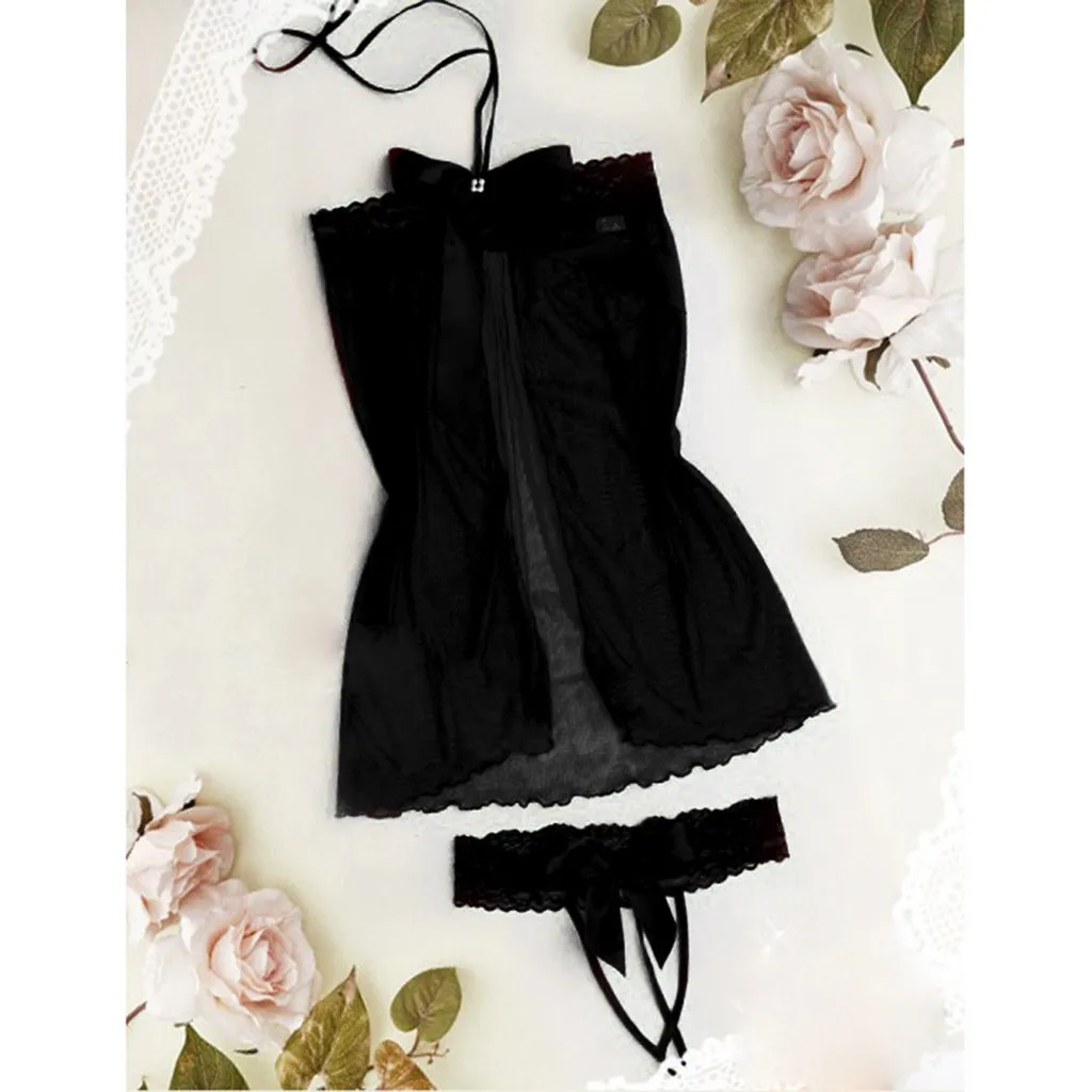 Сексуальное женское белье с лямкой на шее, ночная сорочка, кружевное платье с бантом, комплект нижнего белья, горячая Экзотическая одежда, нижнее белье