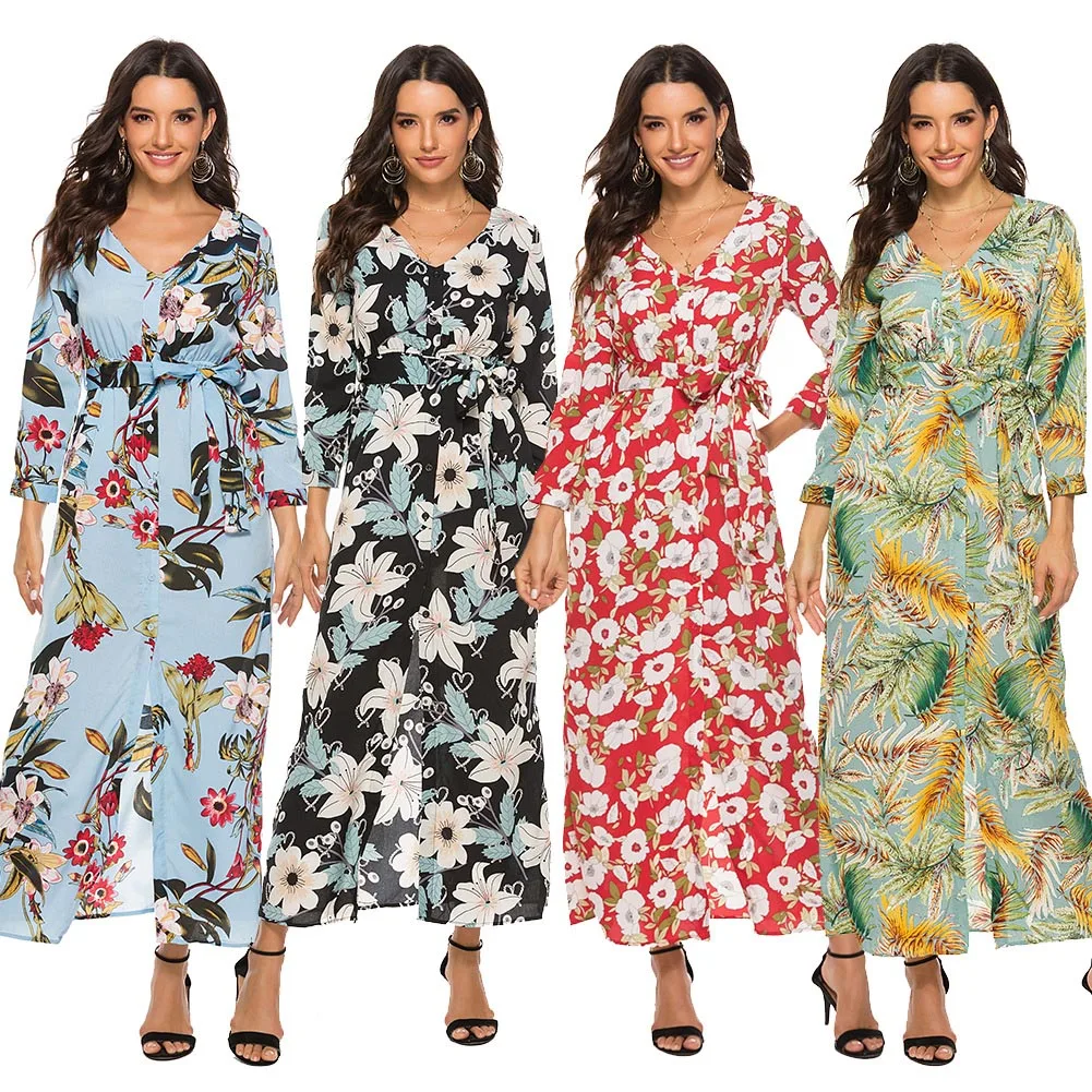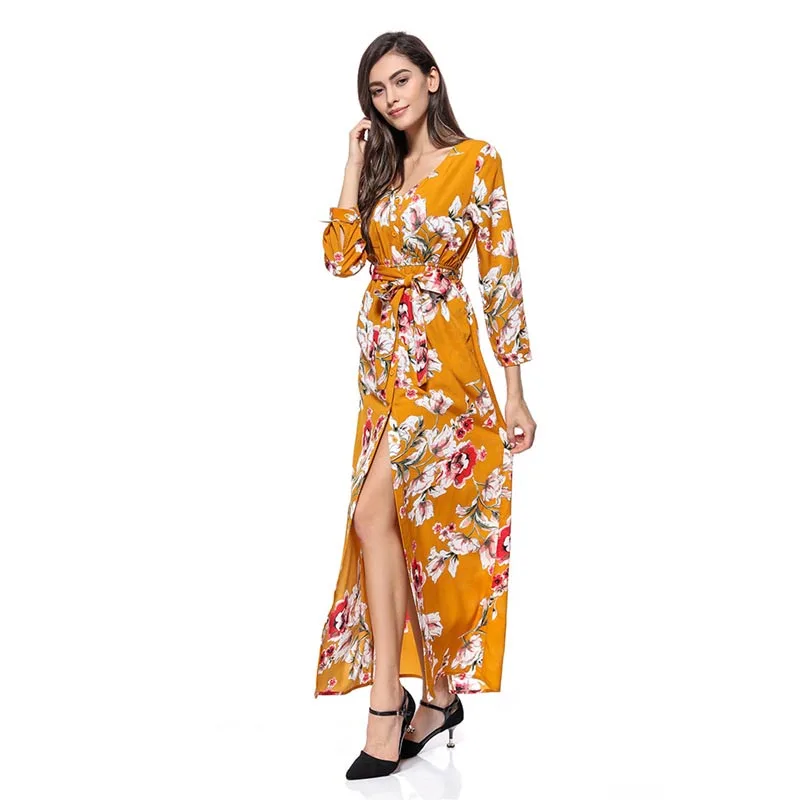 2019 осенне-зимнее женское платье богемное пляжное длинное платье с v-образным вырезом сексуальная открытая вилка женские платья с длинным рукавом и принтом
