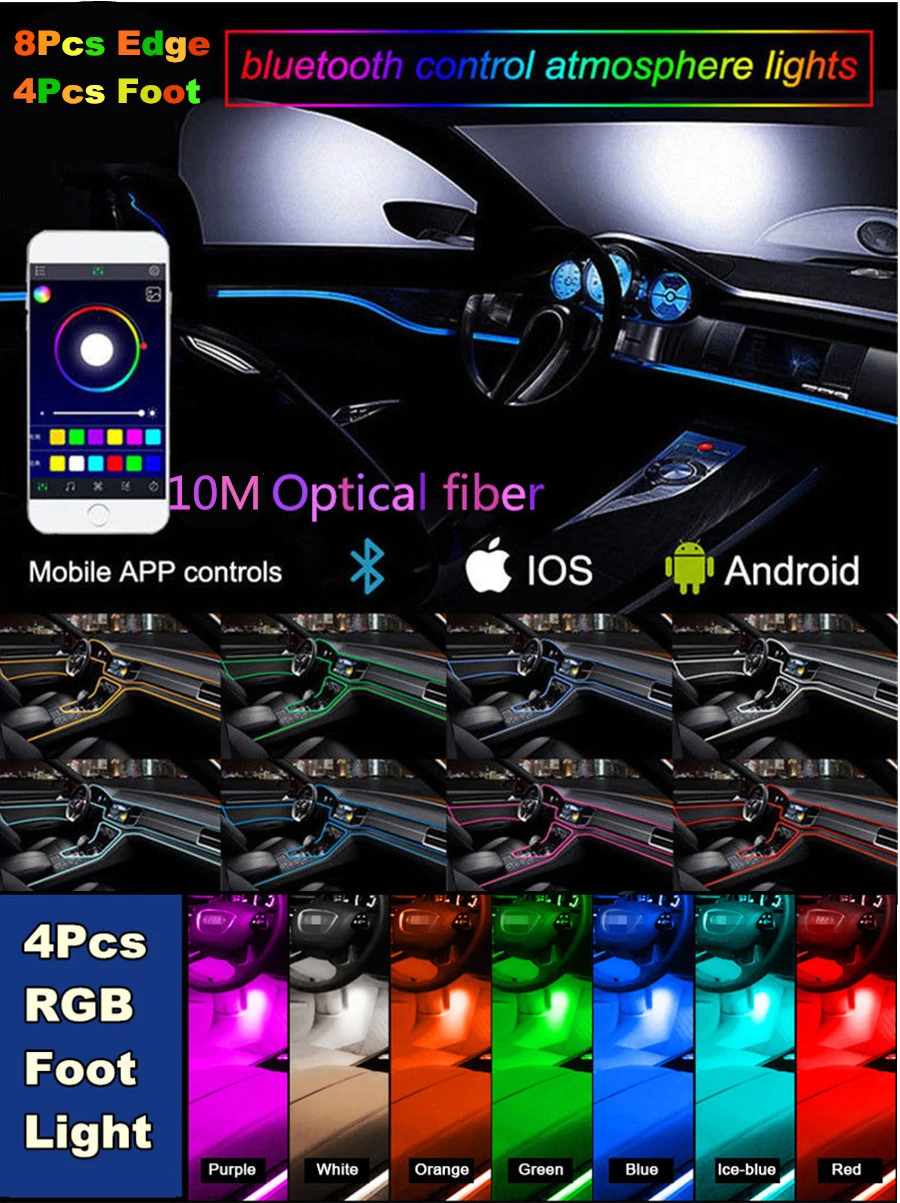 Универсальный светодиодный светильник 12 в 1 RGB с 10 м для стайлинга автомобиля, декоративные атмосферные лампы, напольный ножной светильник для интерьера, Bluetooth App Control, 12 В