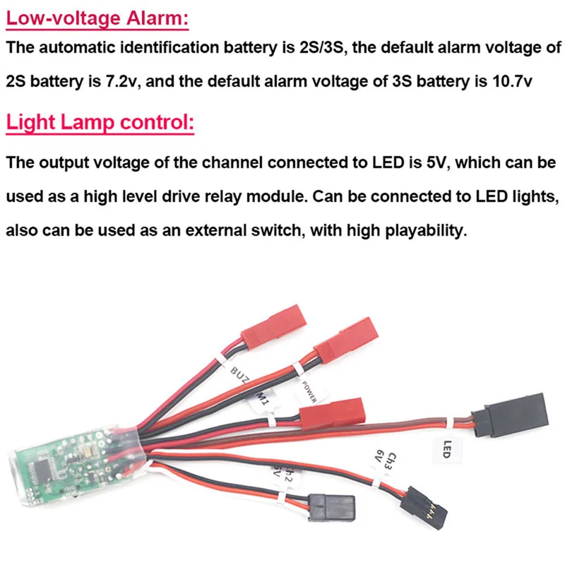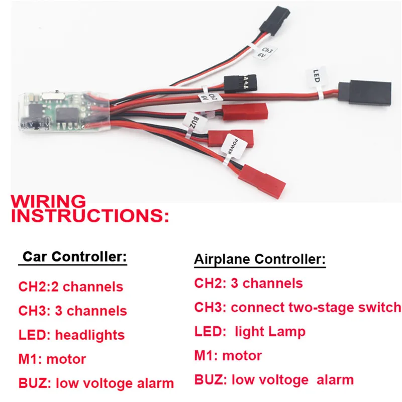 Описание: Марка товара: dumborc Наименование товара: 10А матовый esc Материал: пластик и металлические компоненты Цвет: как на картинке Размер изделия: 165*18*8,5 мм Вес изделия: около 10 г Подходит для: радиоуправляемых моделей автомобилей, лодок, самолетов, для 130/180, 1/24,1/28 автомобилей Соединение CH2: электрически модулированная сигнальная линия (выход 6 в, поддерживает высокое напряжение) CH3: включение/отключение сигнала управления Светодиодный: подключен к фарам (выход 5 В) M1: Двигатель сцепления Буз: звуковой сигнал (сигнал низкого напряжения) Po wer: Подключите аккумулятор Особенности: Липо: 2-3s UBEC:6V Двустороннее управление (вперед, назад) Светодиодный потолочный светильник управления Оповещение о низком напряжении Включение/выключение тормозов Два типа подключения: Автомобильный контроллер: CH2: 2 канала CH3: 3 канала Светодиодный: передние фары M1: двигателя Buz: Сигнализация низкого напряжения Летательный аппарат панель управления CH2: 3 канала CH3: Подключение двухступенчатого переключателя Светодиодный: светильник M1: двигателя Buz: Сигнализация низкого напряжения Лампа контроля: Выходное напряжение канала, подключенного к светодиодный, составляет 5 В, который может использоваться в качестве высокоуровневого дискового реле модуля. Может быть подключен к светодиодный светильник, также может использоваться в качестве внешнего переключателя с высокой степенью воспроизведения. Сигнал низкого напряжения: Автоматическая идентификация батареи 2 S / 3 S, по умолчанию сигнал тревоги напряжение 2 S батареи 7,2 v, и по умолчанию сигнал тревоги напряжение 3 S батареи 10,7 v Посылка включает в себя: 1X 10A ESC
