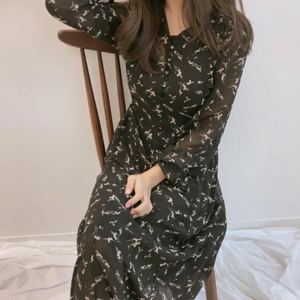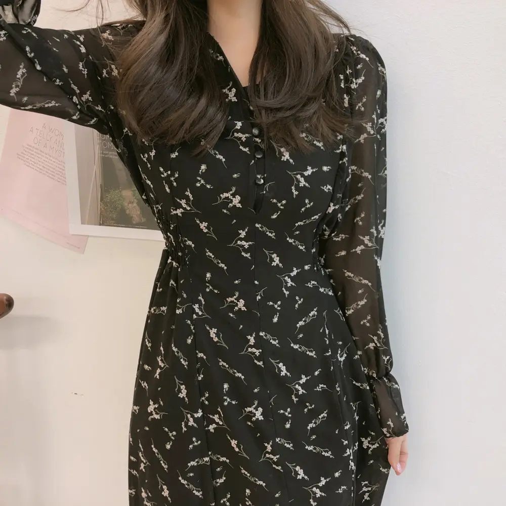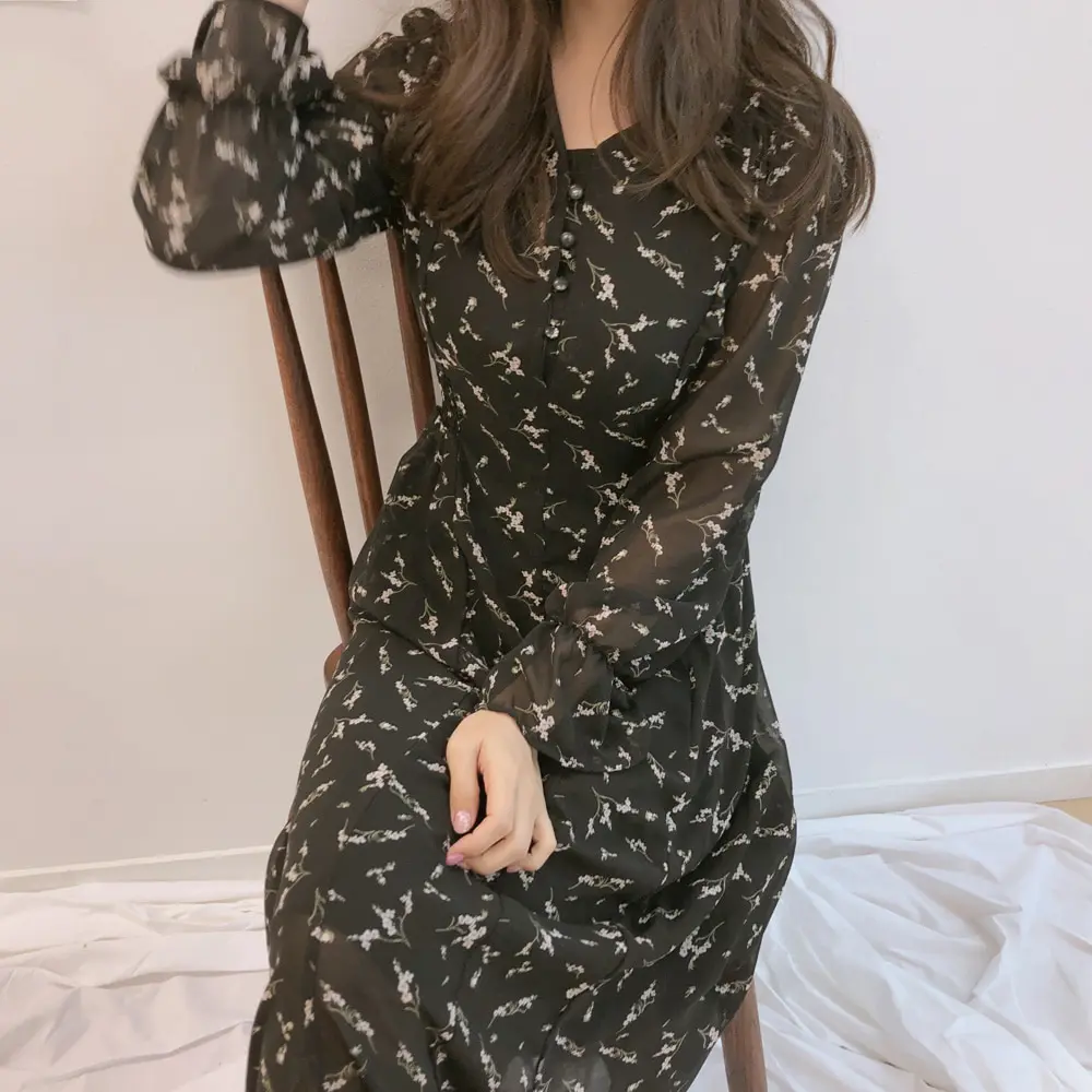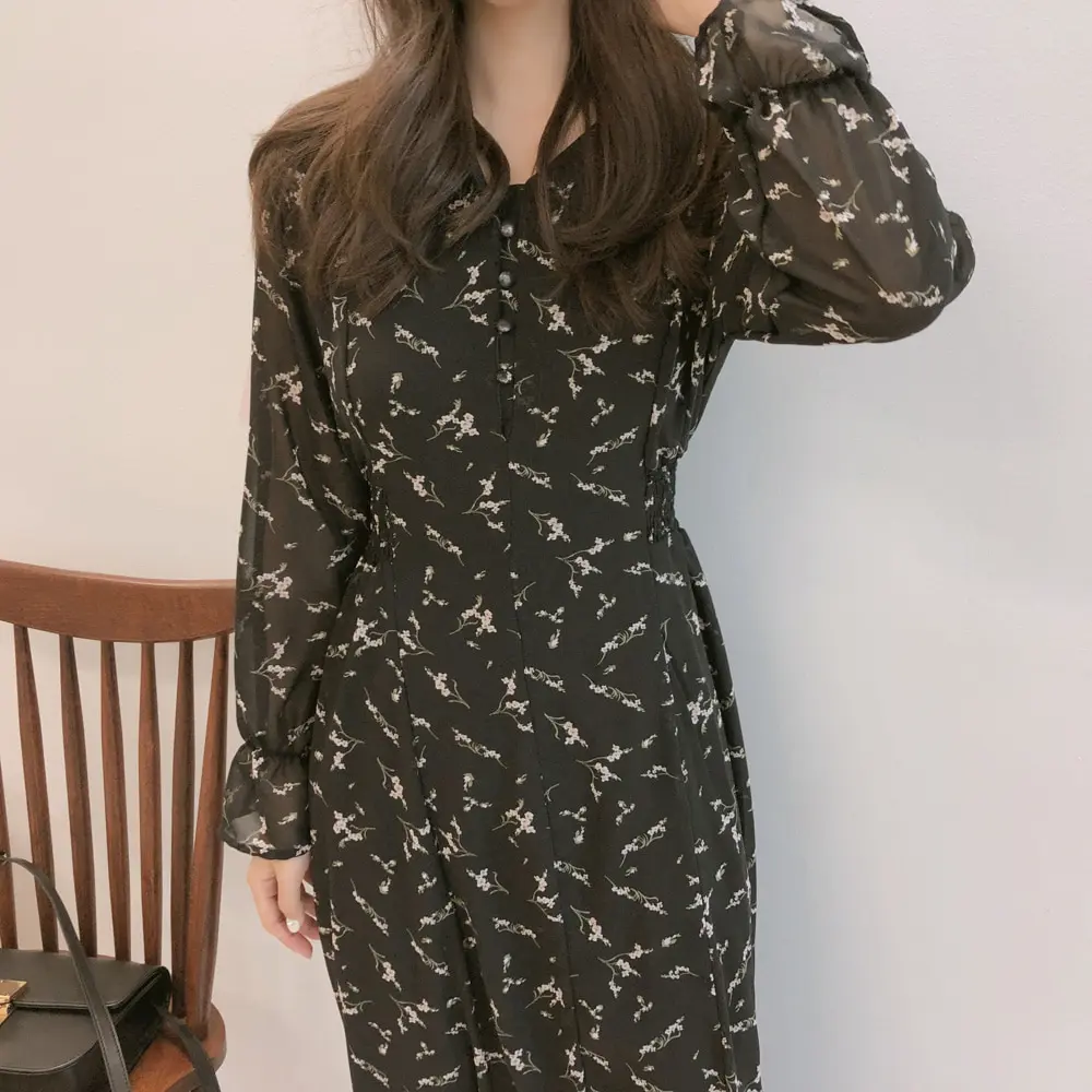 Базовые платья для девочек на осень и зиму, милое длинное ТРАПЕЦИЕВИДНОЕ винтажное платье-рубашка с расклешенными рукавами и цветочным принтом на пуговицах, одежда в Корейском стиле, 8131