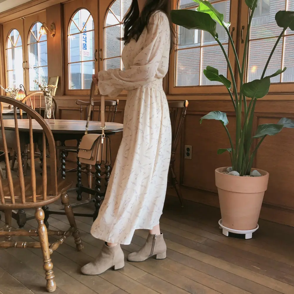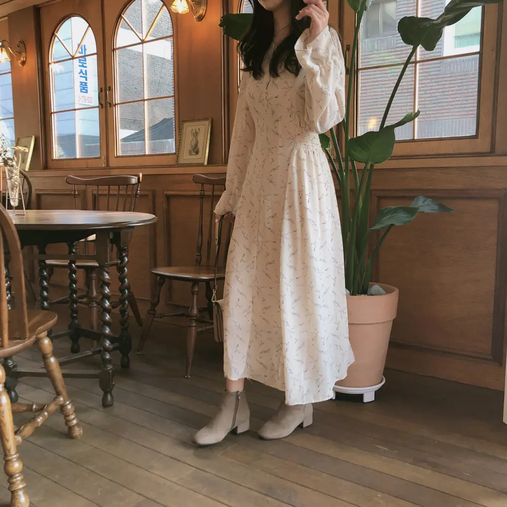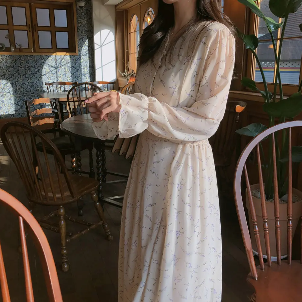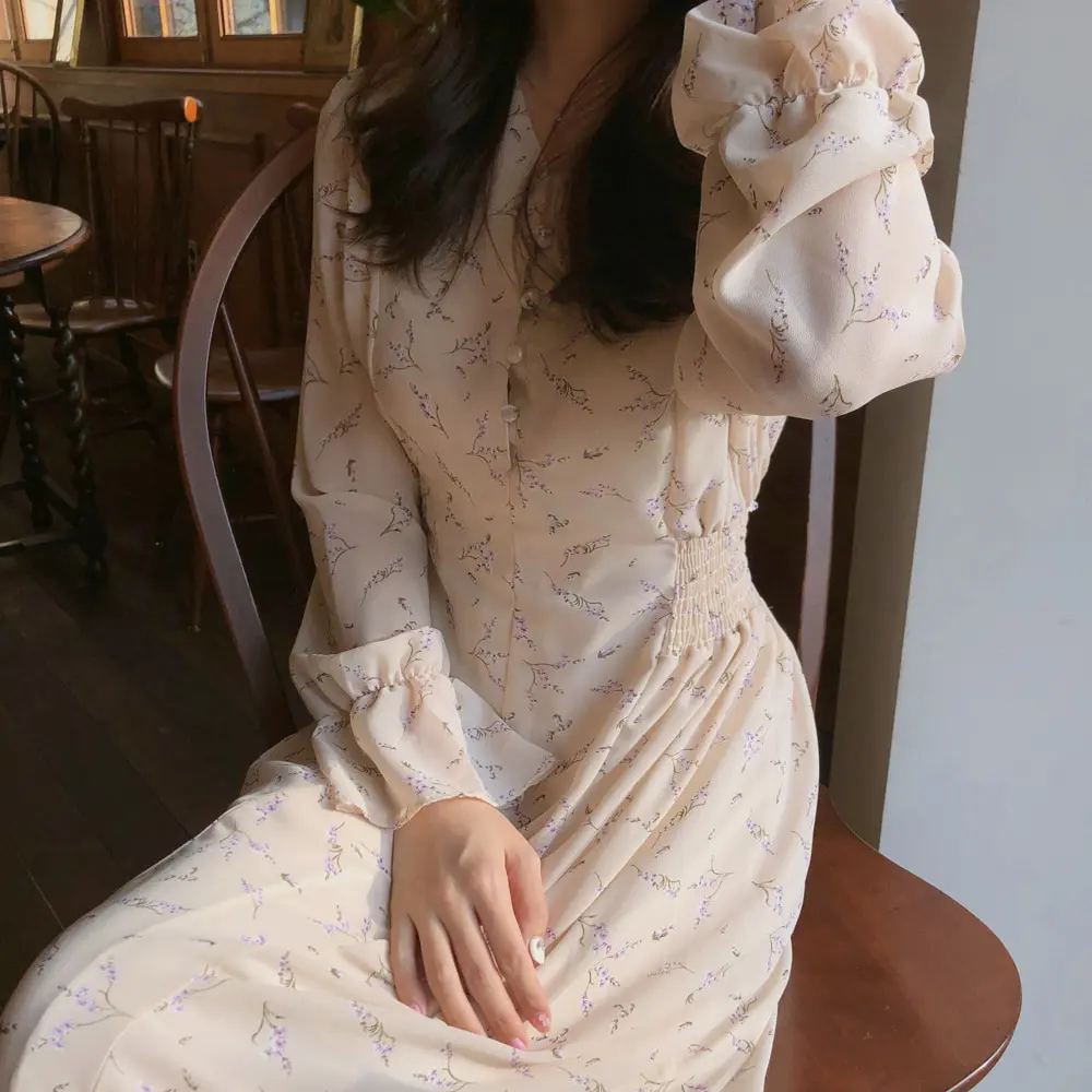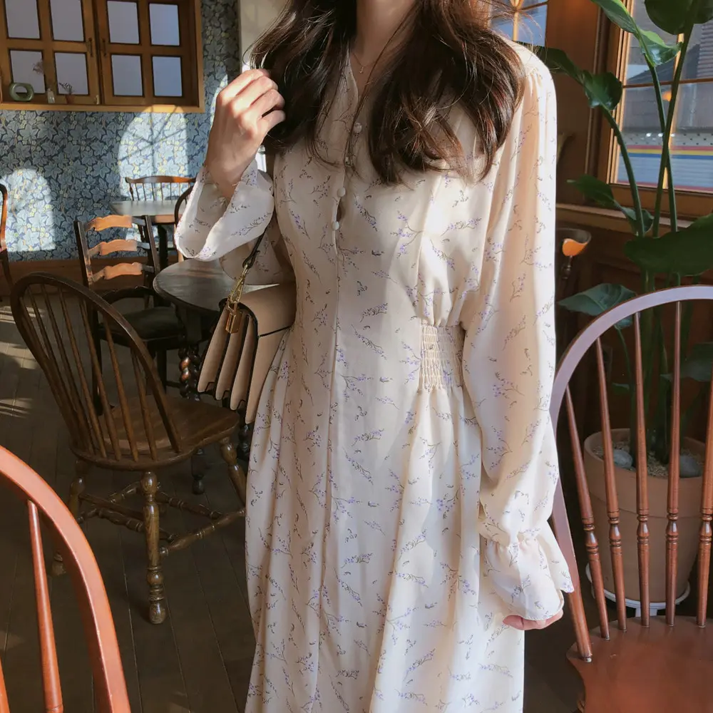 Базовые платья для девочек на осень и зиму, милое длинное ТРАПЕЦИЕВИДНОЕ винтажное платье-рубашка с расклешенными рукавами и цветочным принтом на пуговицах, одежда в Корейском стиле, 8131