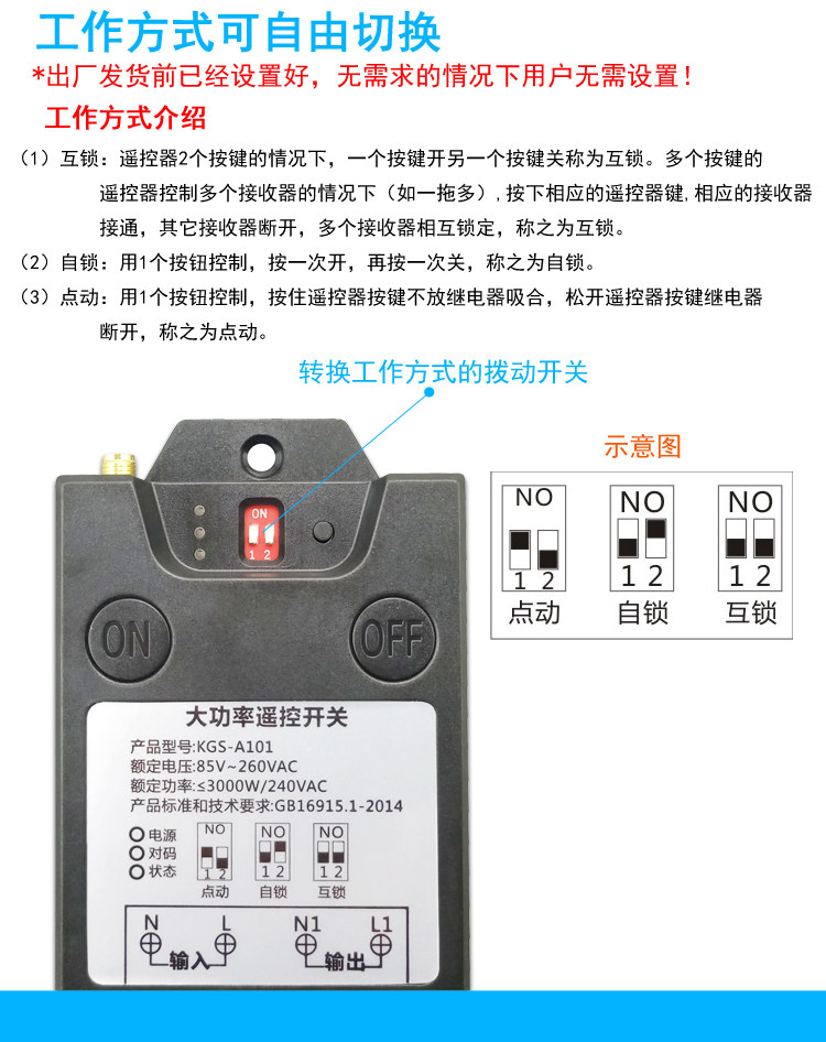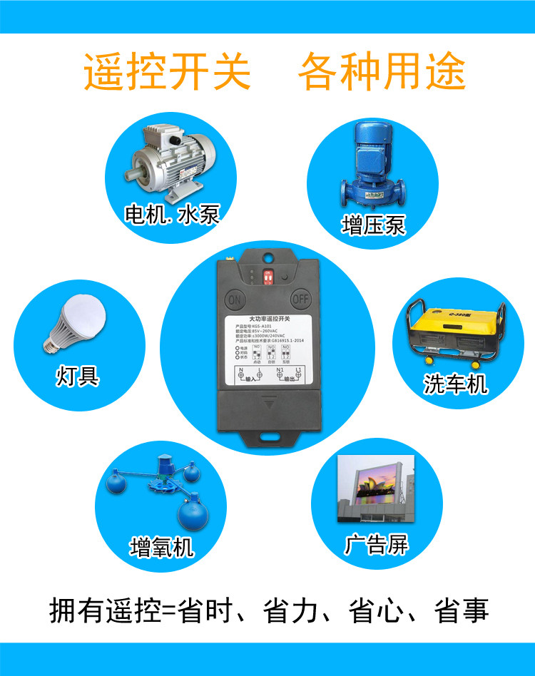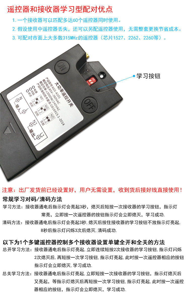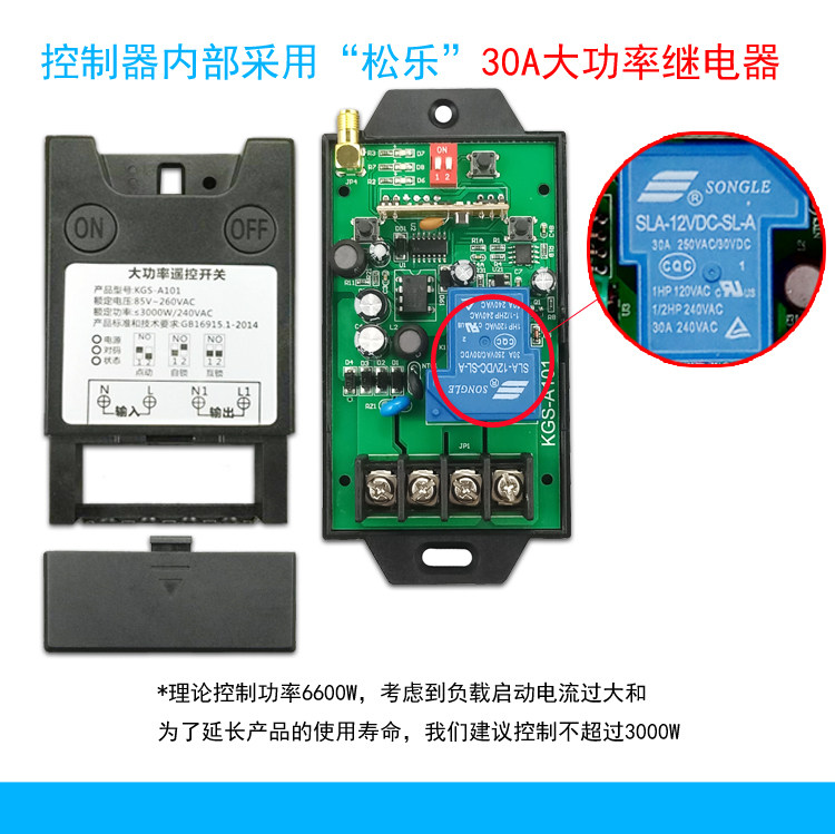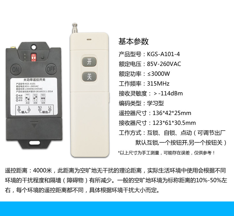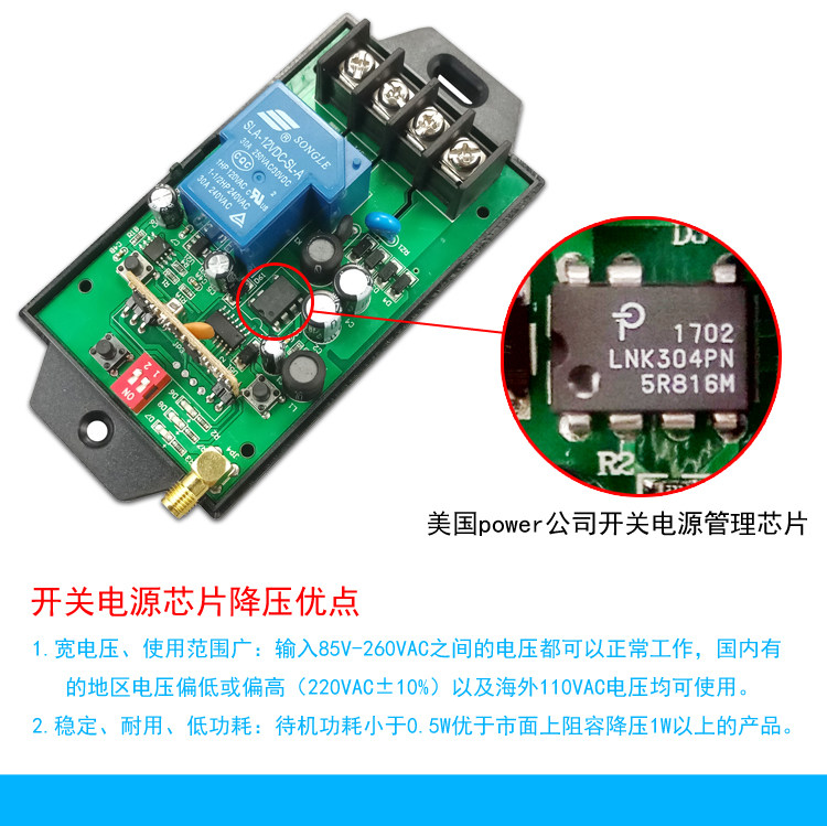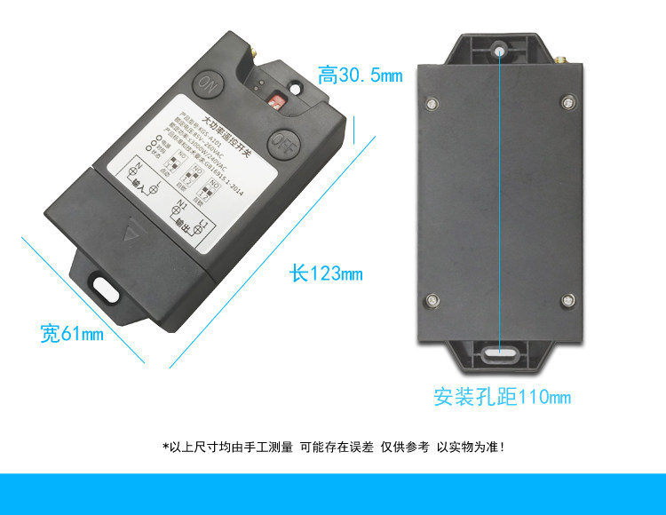 Scope of application: 220V household electric power, electric appliances with power less than 3000 watts can control its power supply and power off, such as: water pump, mud pump, motor, lamps, fans, fans, insecticides, sprayers, car washing machines, Electric bells...etc. Features: 1>. Long distance: It adopts imported UHF three-level signal to amplify the launching tube, which is farther away from the 3,000-meter remote control on the market. 4000 meters is the theoretical distance. The general open-air remote control distance is between 1000m and 3000m ( The environment is different, the distance is also different, the actual use depends on the size of the environmental disturbance), and the distance will be shortened in the case of obstacles. 2>. Switching power supply step-down circuit: using the switching power supply chip LNK304 produced by American POWER Company to control the power supply, quality assurance, stability and durability. 3>. Wide voltage: Suitable for voltage between AC85V-260V, ensuring long-term stable operation in circuits with different voltage environments. 4>. High power: Adopt Ningbo Songle 30A relay to ensure long-term stable control of high-power electrical appliances.No need to use AC contactor, directly control the water pump, motor, lamp, car washing machine and other electrical appliances within 3000W. 5>. High sensitivity: The signal receiving adopts the real superheterodyne RXB8 module, the sensitivity is -114dBm, the sensitivity and anti-interference ability are far beyond the super-regeneration on the supermarket surface and the ordinary superheterodyne module, the remote control distance is farther and more stable. 6>. Learning type code: You can learn the code with the same frequency remote control at will. (Don't worry if you lose the remote control during the process. Just buy a remote control and learn it. It is OK, no need to replace it, which greatly saves the user. cost). 7>. The operation is simpler: the remote control has 2 buttons, one button is on, and one button is off, which is convenient and easy to use. 8>. Do not interfere with each other: digital coding is used, and there is no mutual control phenomenon between the same model products of neighbors. (ie: multiple sets of the same model can be used in the same environment without mutual control.)
