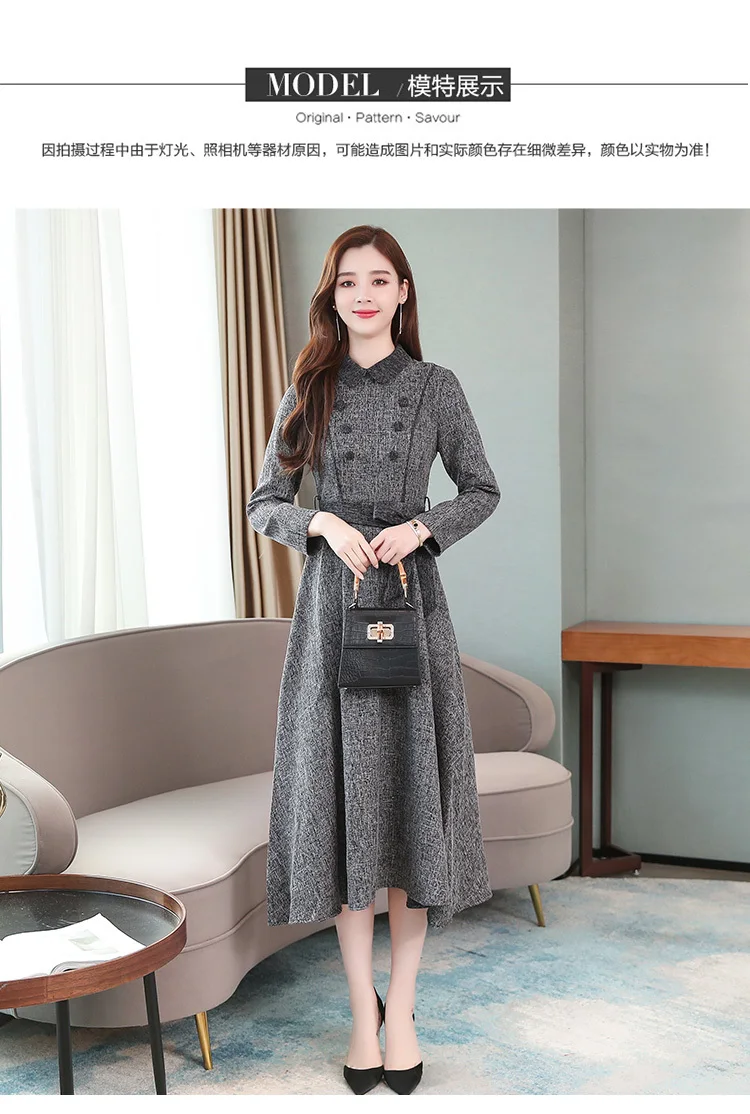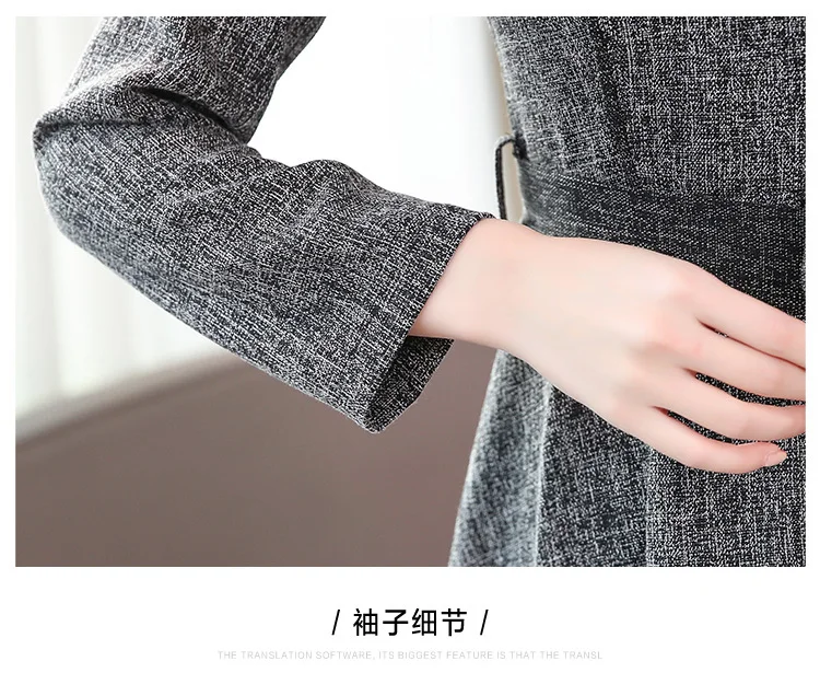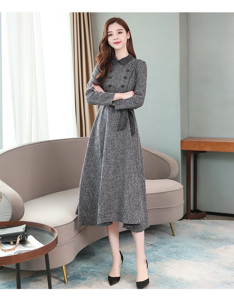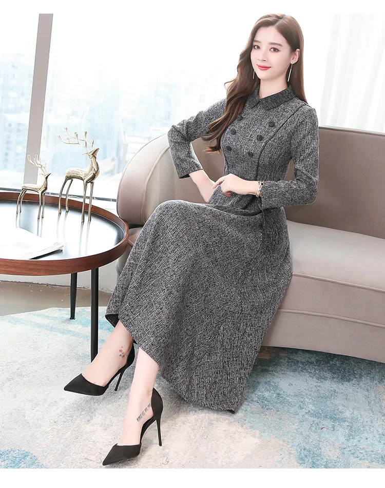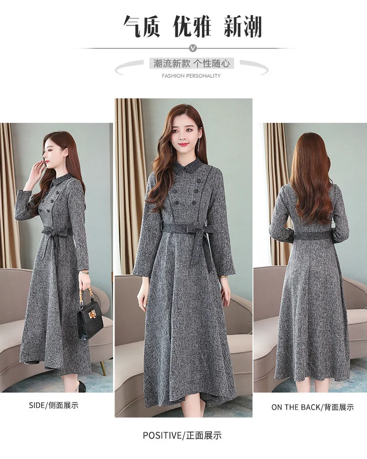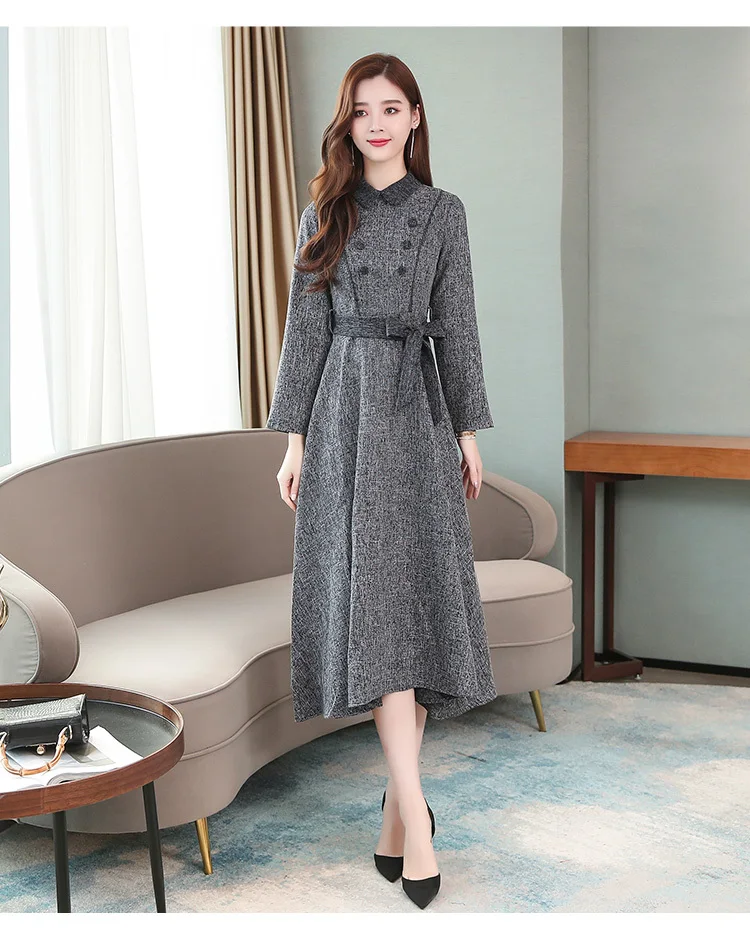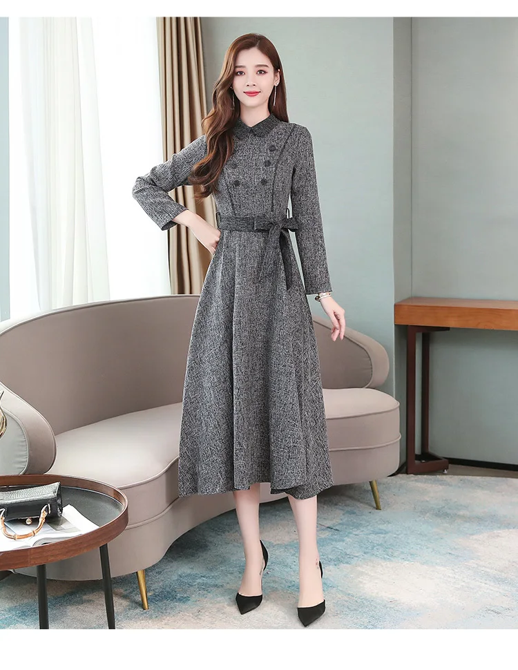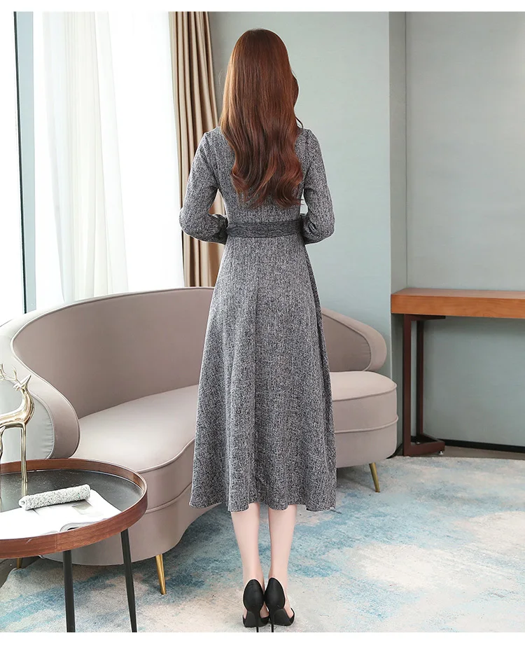 Осенне-зимнее женское длинное утепленное платье, элегантное модное повседневное офисное платье, серое весеннее платье с поясом и длинным рукавом, корейские платья