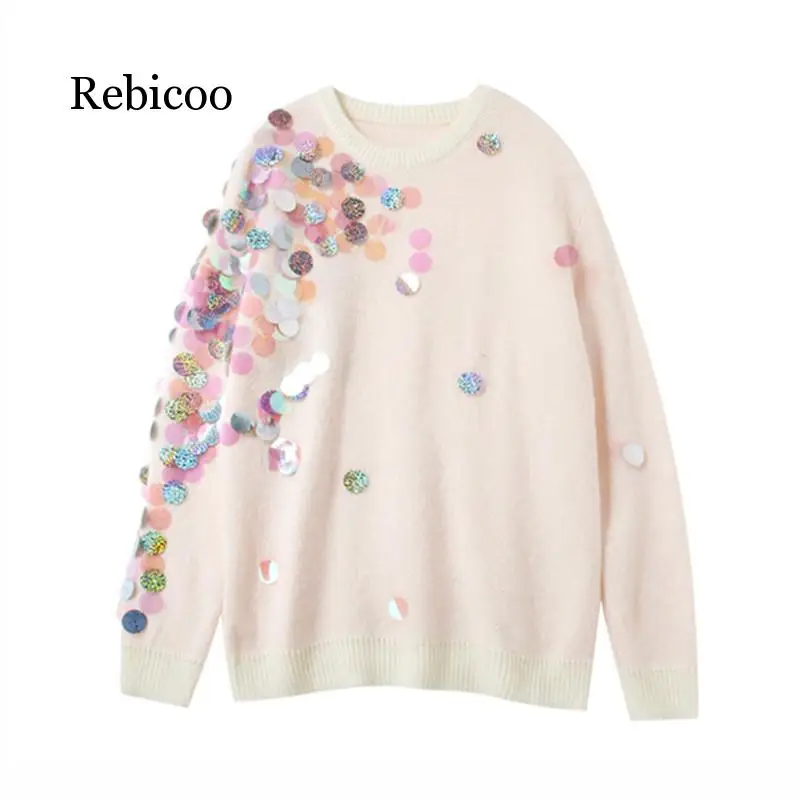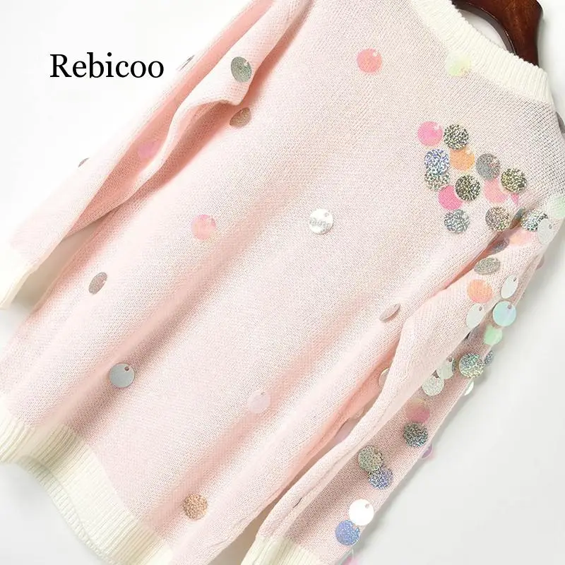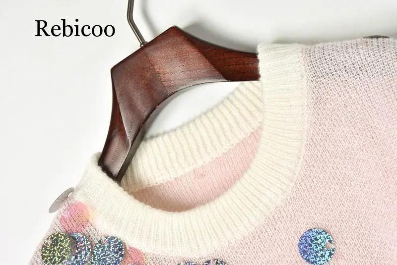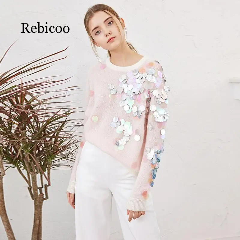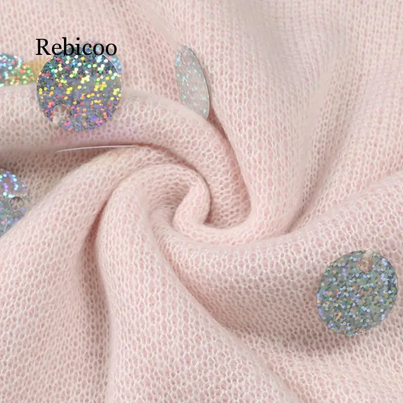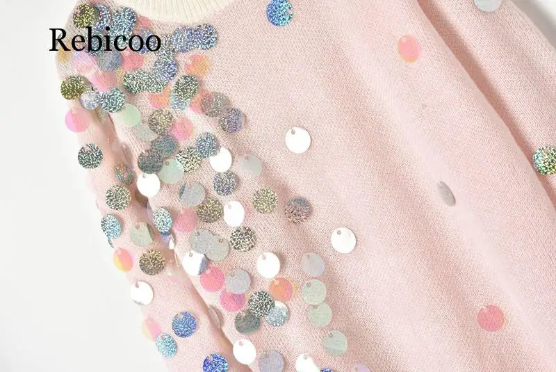 2019 новые одежды для девочек в розовом цвете, Круглый воротник шерсть, мохер свитер с вышивкой блестками свитер с пайетками для женщин