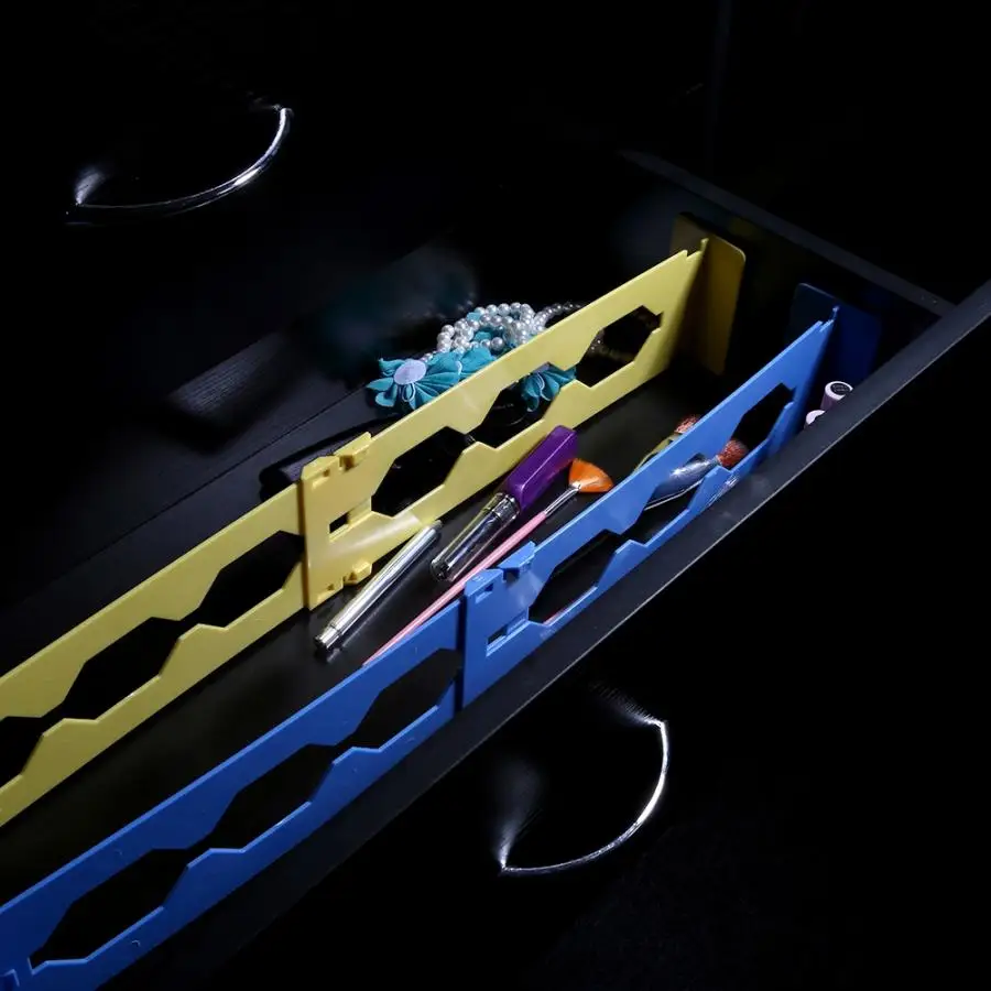Наш разделитель является отличным решением для организации ящика в вашей кухне, спальне, ванной комнате, офисе и т. д., это может сделать ваш ящик действительно чистым и аккуратным. Его высота составляет 3,5 дюйма, и его длину можно регулировать от 12,8 до 21,7 дюймов, чтобы соответствовать большинству ящиков. Он также может быть легко установлен и перемещен без каких-либо повреждений вашего ящика. 5 различных цветов могут быть для вас на выбор, так чего вы ждете? Такой практичный и приятный разделитель, стоит купить!