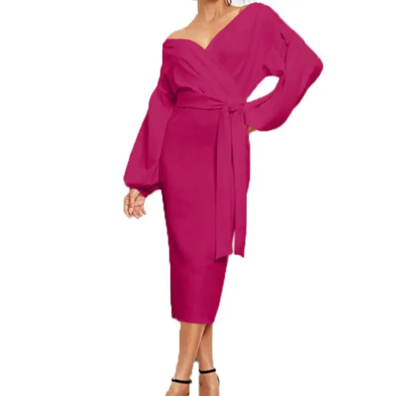 Женское облегающее платье миди с пышными рукавами и открытыми плечами, длинное платье с поясом и высокой талией, коктейльное вечернее платье с v-образным вырезом, клубная одежда