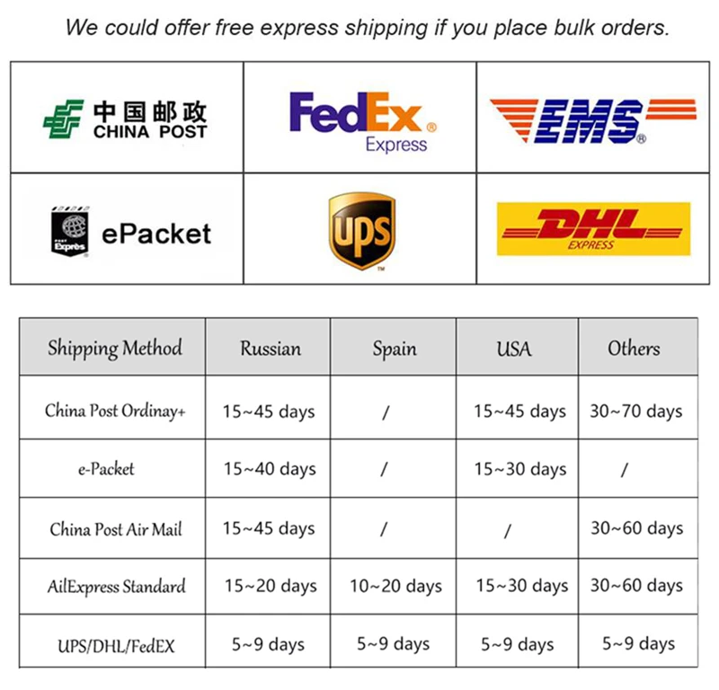 Если вы хотите получить продукцию быстрее, пожалуйста, свяжитесь с нами, чтобы оплатить дополнительную стоимость доставки, мы можем предоставить вам следующие более быстрые и дешевые способы доставки: UPS, DHL, Fedex, TNT, DEPX, EMS. Таким образом, вы можете получить товар в течение 5-7 рабочих дней.