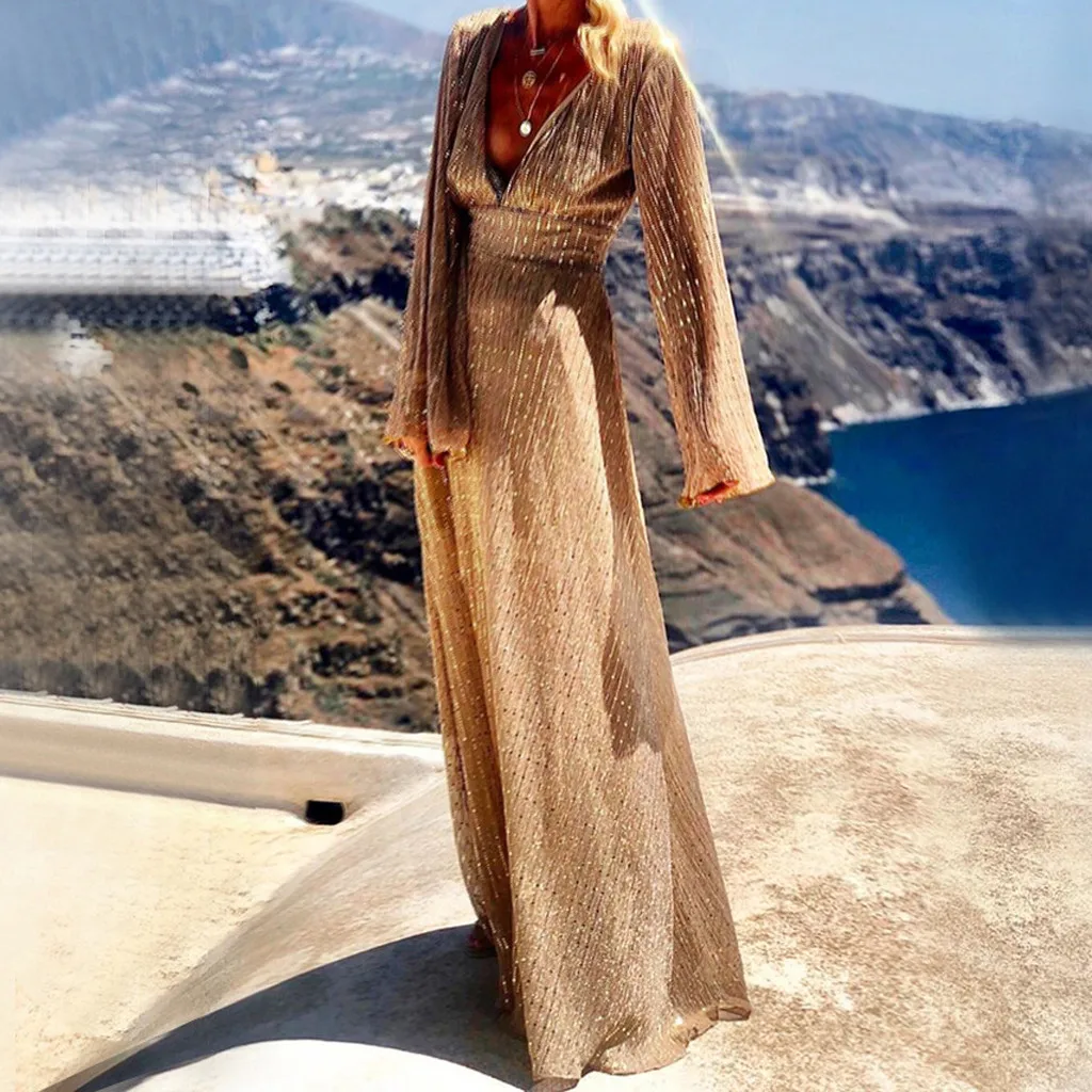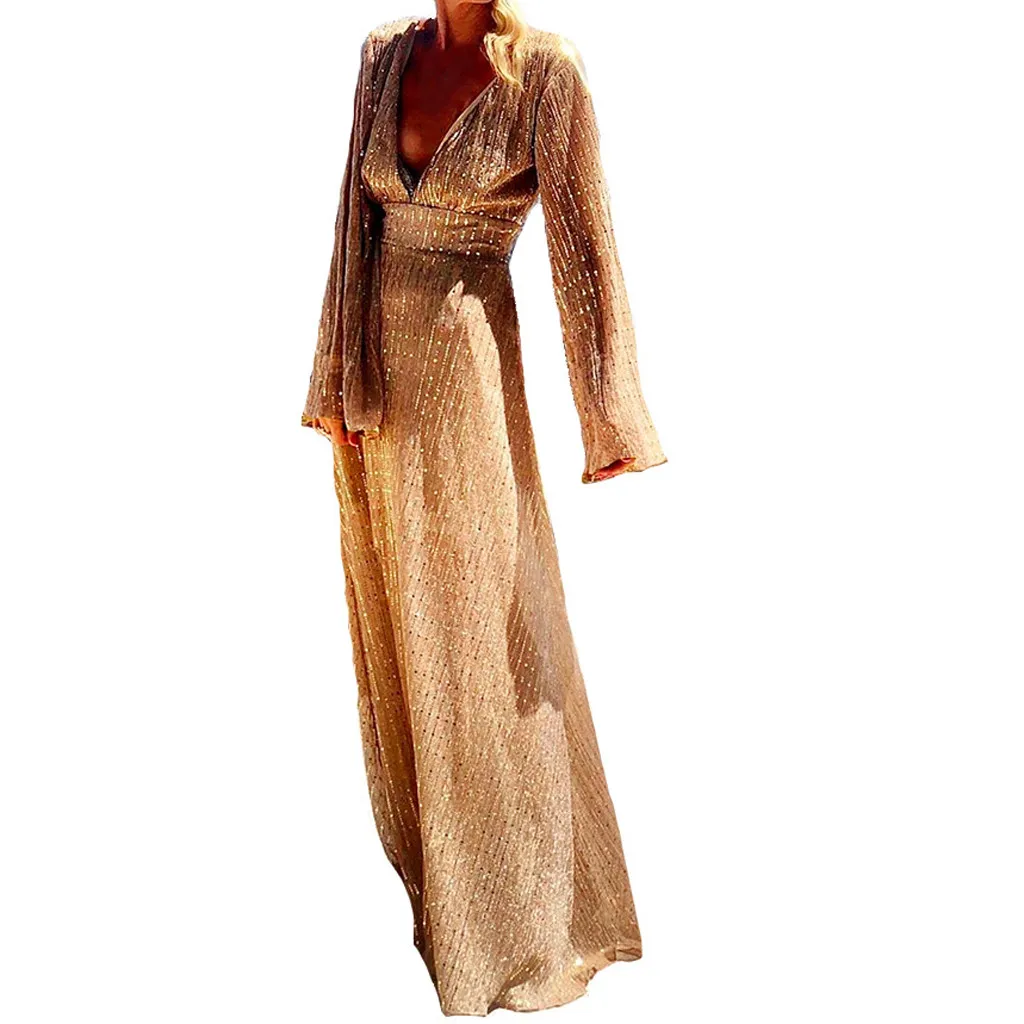 4. Это блестящее длинное платье с v-образным вырезом позволит вам выглядеть более модно, очаровательно и сочетаться с другой обувью.