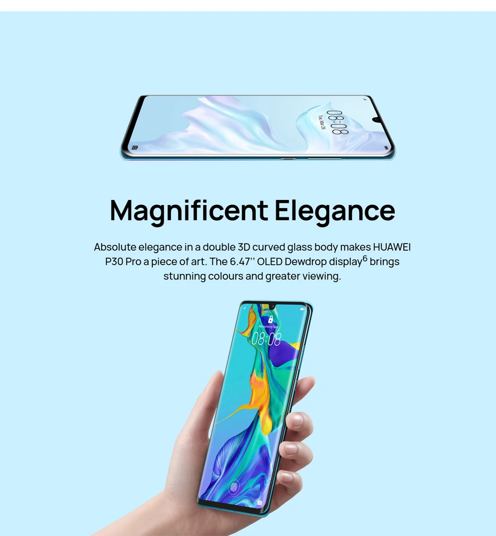 Абсолютная элегантность в двойном 3D изогнутом стеклянном корпусе делает HUAWEI P30 Pro частью искусства. OLED Dewdrop display6 6,47 ''придает потрясающие цвета и больший обзор.