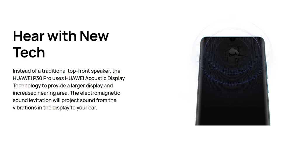 Вместо традиционного топового динамика HUAWEI P30 Pro использует технологию акустического дисплея HUAWEI, чтобы обеспечить больший дисплей и увеличенную область слуха. Электромагнитная звуковая Левитация проецирует звук от вибрации на дисплее до вашего уха.