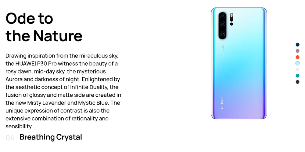 Вдохновляясь чудесным небом, HUAWEI P30 Pro демонстрирует красоту розового рассвета, неба середины дня, таинственной Авроры и темноты ночи. Вдохновленные эстетической концепцией бесконечной двойственности, сочетание глянцевой и матовой стороны создано в новом туманном лавандовом и мистическом синем цвете. Уникальным выражением контрастности является также широкое сочетание рациональности и чувствительности.