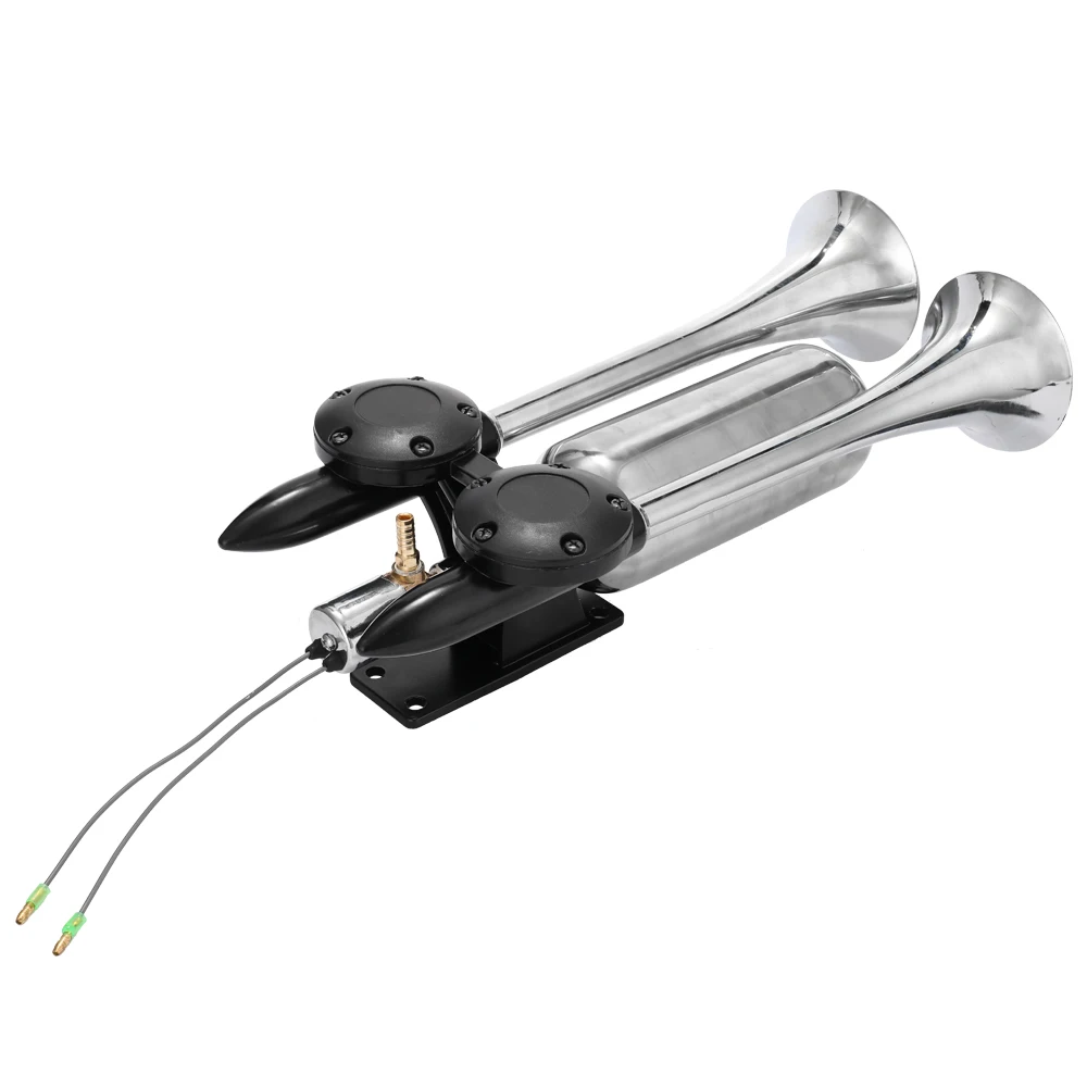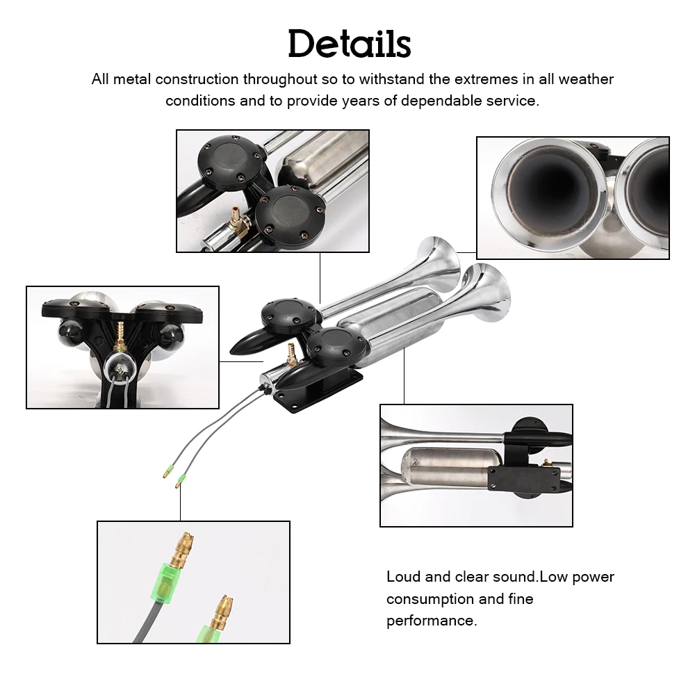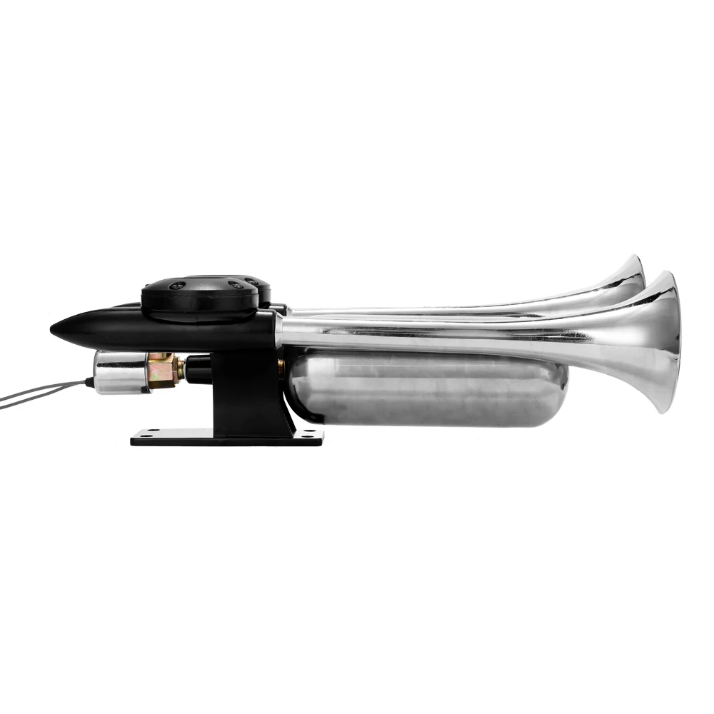 Гудок является идеальным дополнением к автомобилям 12 В или 24 В. Этот привлекательный гудок спроектирован с воздушной камерой между трубами, которая будет создавать мощный эхо-звук, который копирует локомотив. Полностью металлическая конструкция способна выдерживать экстремальные погодные условия и обеспечить годы надежного обслуживания. Основание Рожков окрашено черной эмалью, и трубы и воздушная камера имеют яркое хромированное покрытие, которое украсит любое большое или маленькое транспортное средство.