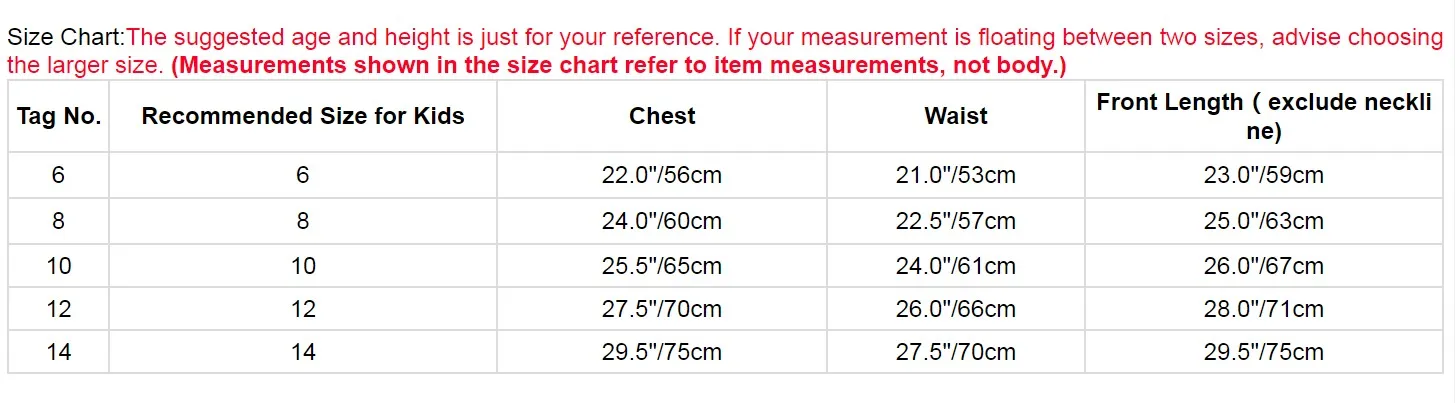 | Размер на бирке. | Рекомендуется Размеры для детей | Обхват груди | Обхват талии | Длина спереди (без воротника) |