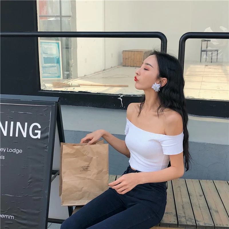 Особенности: Корейская версия, топ без пятки, сплошной цвет, сексуальный, тонкий, короткий, футболка