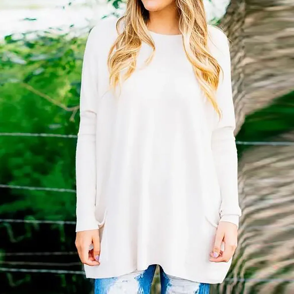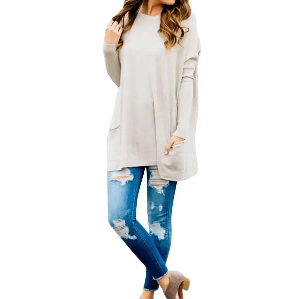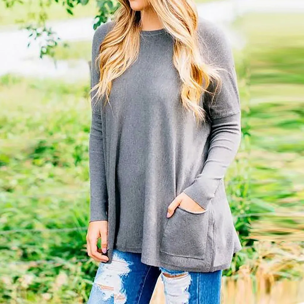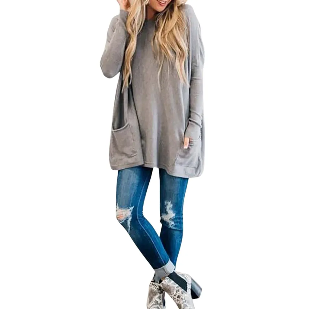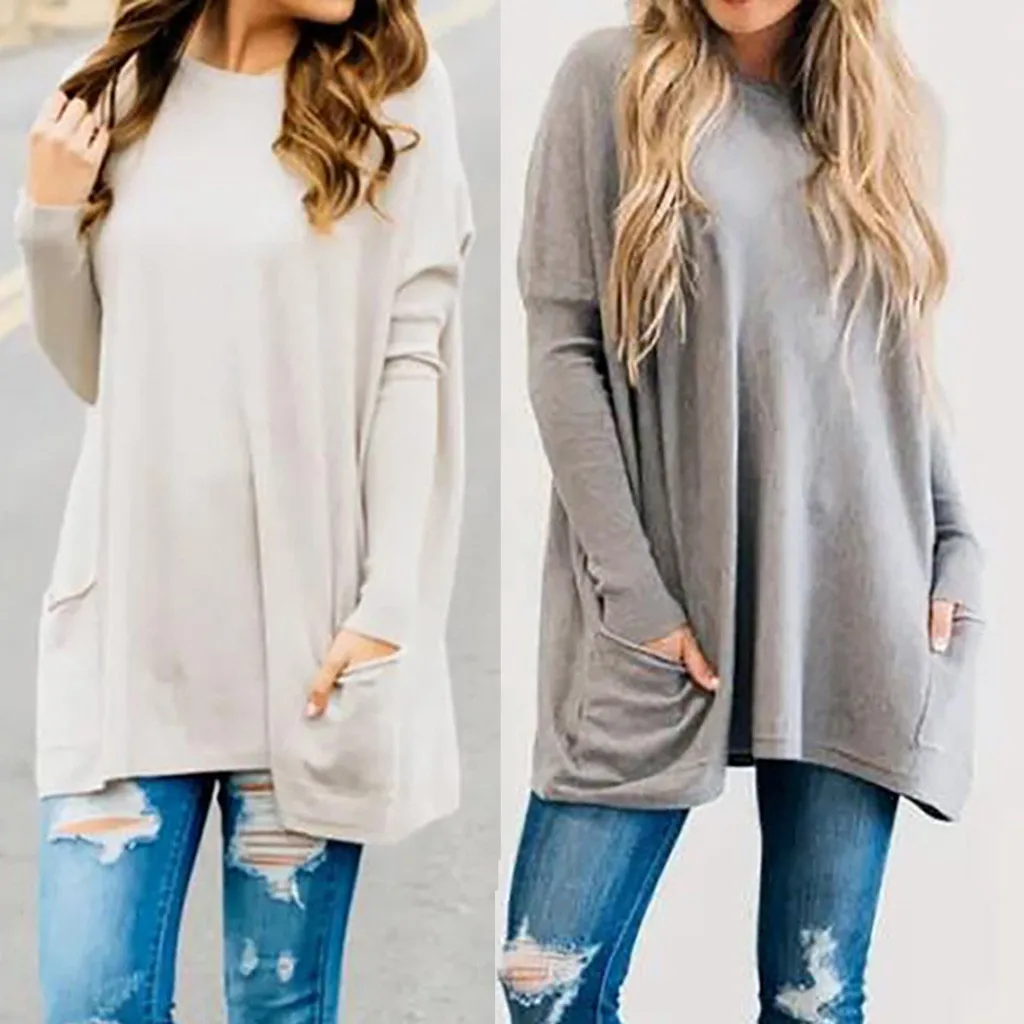 1. Особенности:Модная повседневная одежда; Сезон осень; Круглый вырез; Однотонный; С карманами; С длинными рукавами; В стиле пэчворк; Свободные топы.