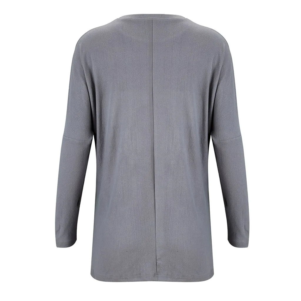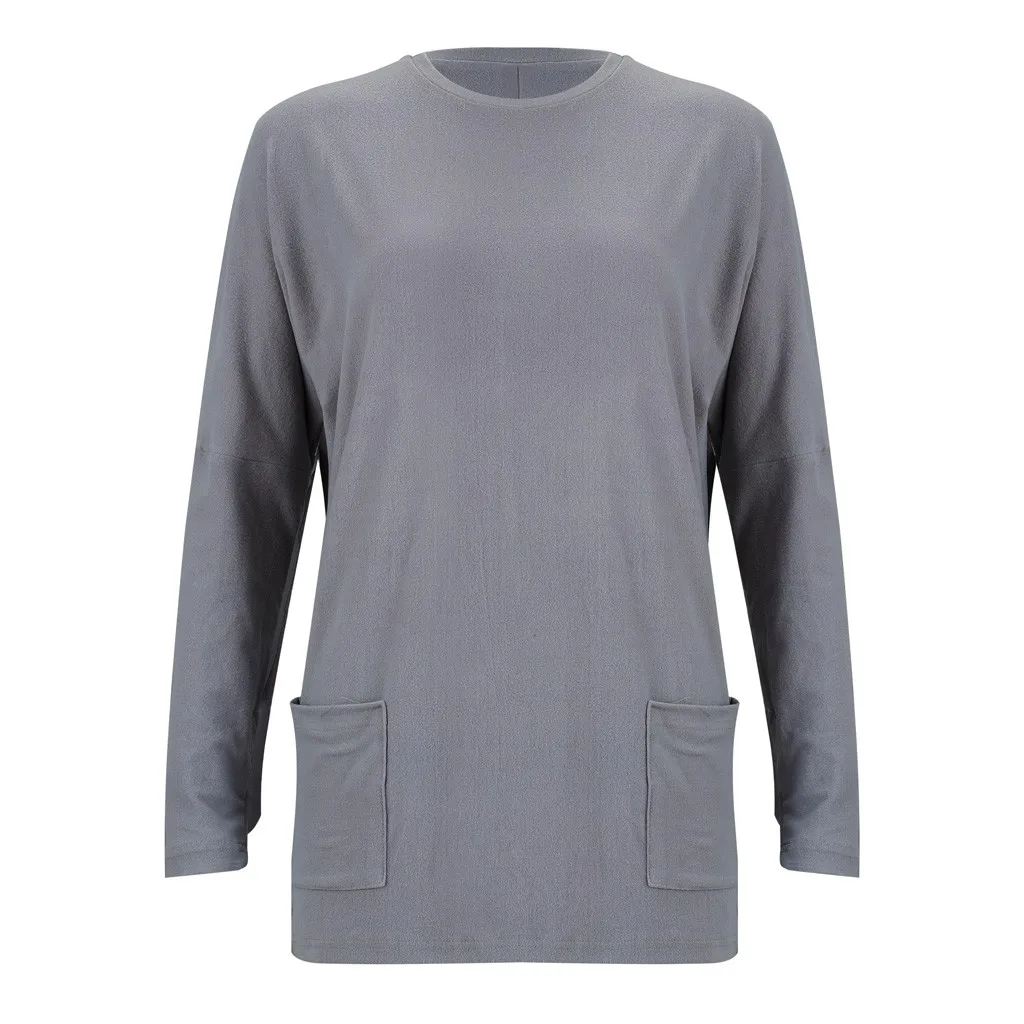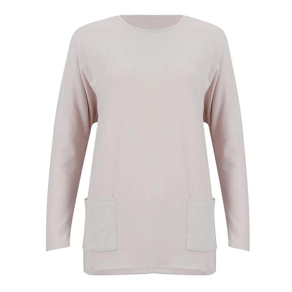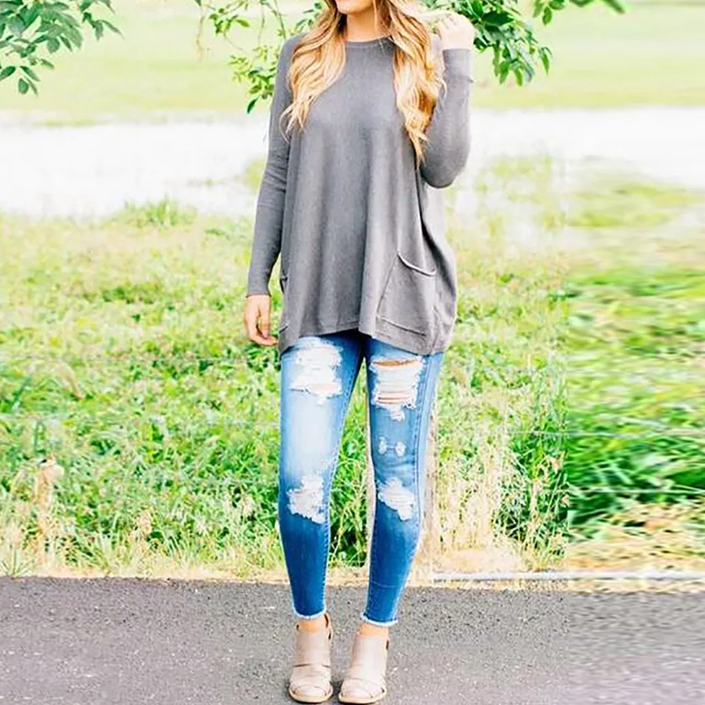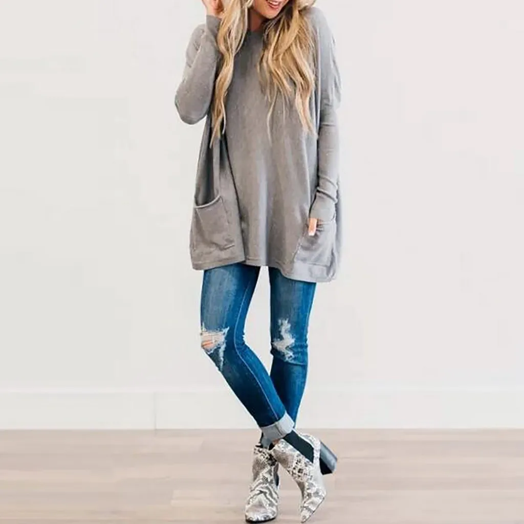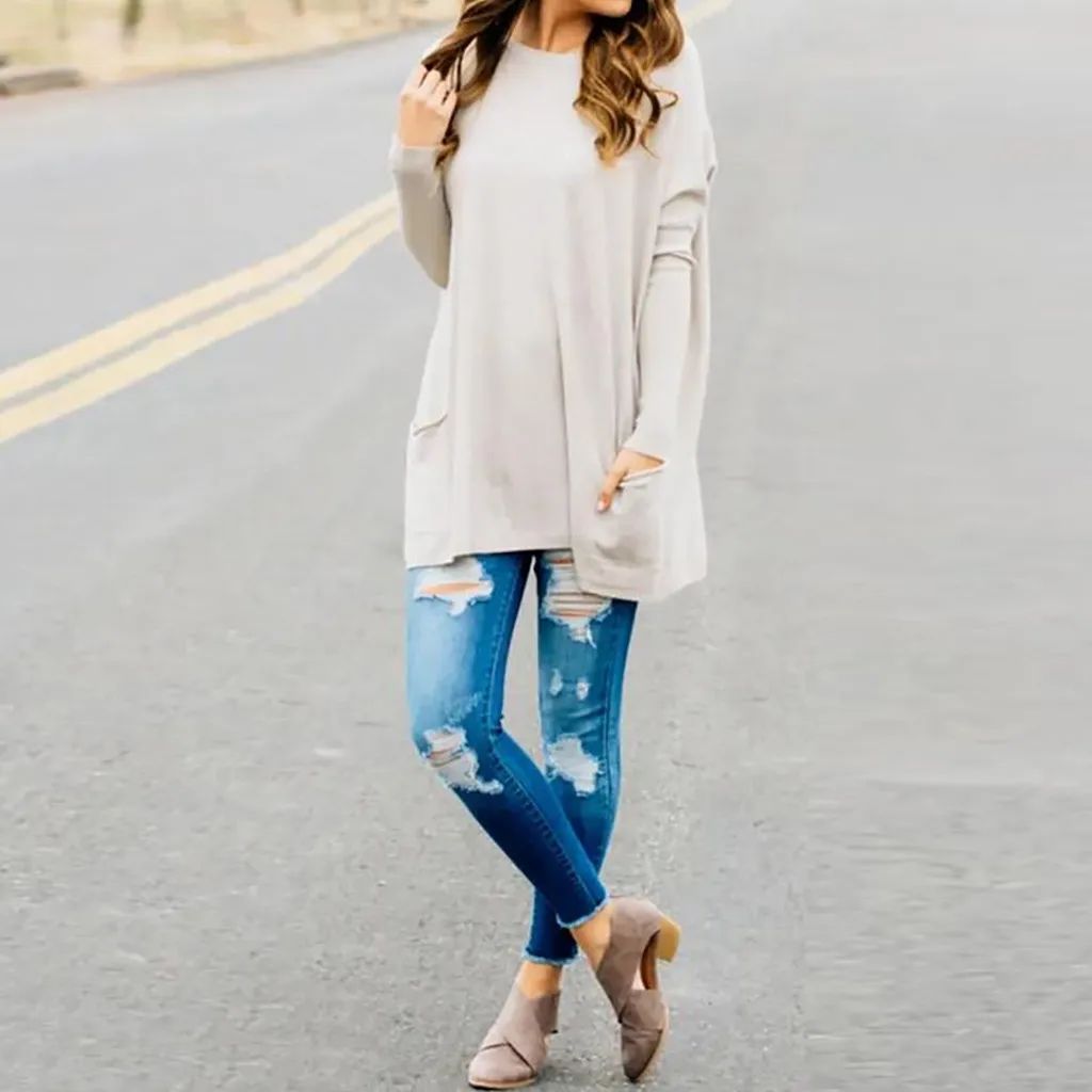 1. Особенности:Модная повседневная одежда; Сезон осень; Круглый вырез; Однотонный; С карманами; С длинными рукавами; В стиле пэчворк; Свободные топы.