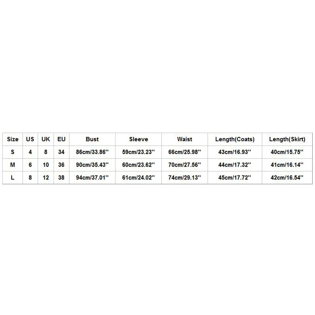 | Размер: L | США: 8 | Великобритания: 12 | ЕС: 38 | Обхват груди: 94 см/37,01 дюйма | Рукав: 61 см/24,02 дюйма | Талия: 74 см/29,13 дюйма | Длина (пальто): 45 см/17,72 дюйма | Длина (юбка): 42 см/16,54 дюйма |