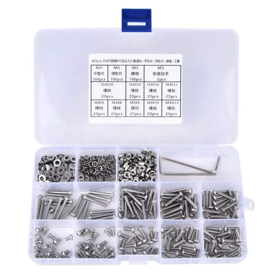 662 шт. SUS304 M3 головка с шестигранной головкой винт гайка плоская шайба пружинная прокладка гаечный ключ ремонтный комплект