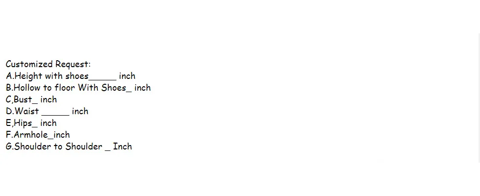 1. The size and the color are very important to the dress,so when you choose the color and size,please make the choose as our color chart and size chart,because the size maybe a lit different with your country. 2. If you want to custom made dress,please leave a message to us about your detailed size bust___,waist___,hips___,hollow to floor with shoes___inch or cm and measure yourself as our measure instruction. 3. If you have any question , please contact us freely, and we are always at your service.