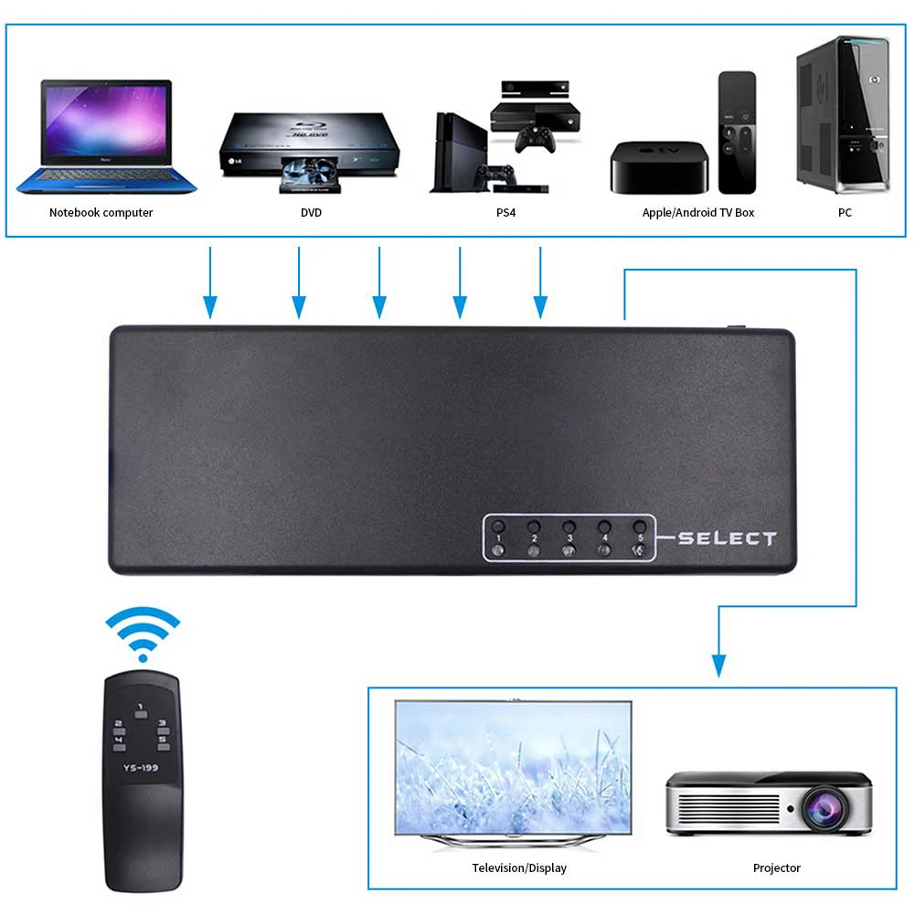 -Совместимый переключатель 5 cut 1hdmi-можно подключить Пять источников сигнала высокой четкости к терминалу дисплея высокой четкости.