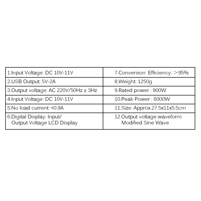 Доступный Диапазон номинального напряжения электроприборов: 210 ~ 230 В, 110 ~ 130 В. Безопасный диапазон Вход Напряжение: 12V: 9,8 ~ 15V.
