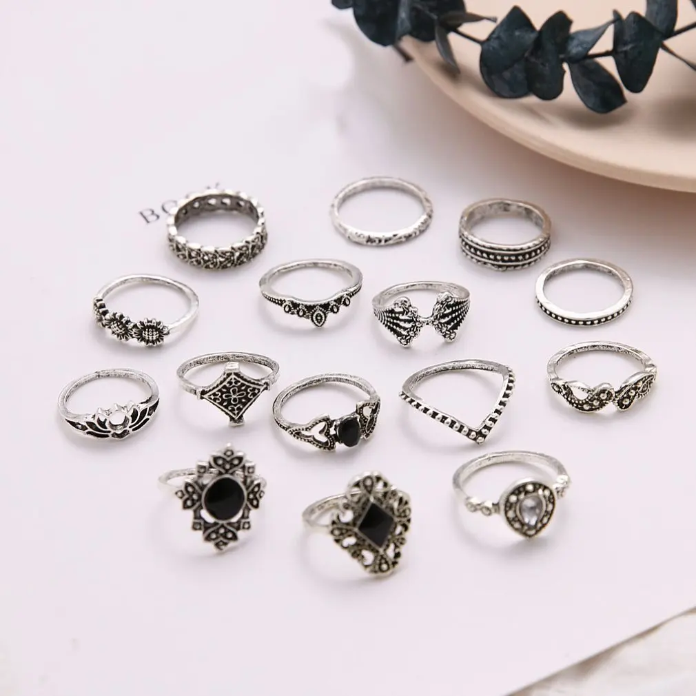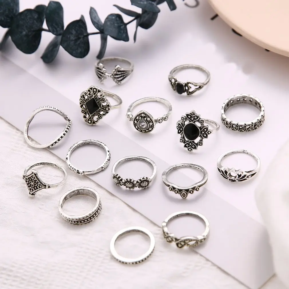 Набор ажурных колец с изображением лотоса подсолнуха и геометрических камней черного цвета