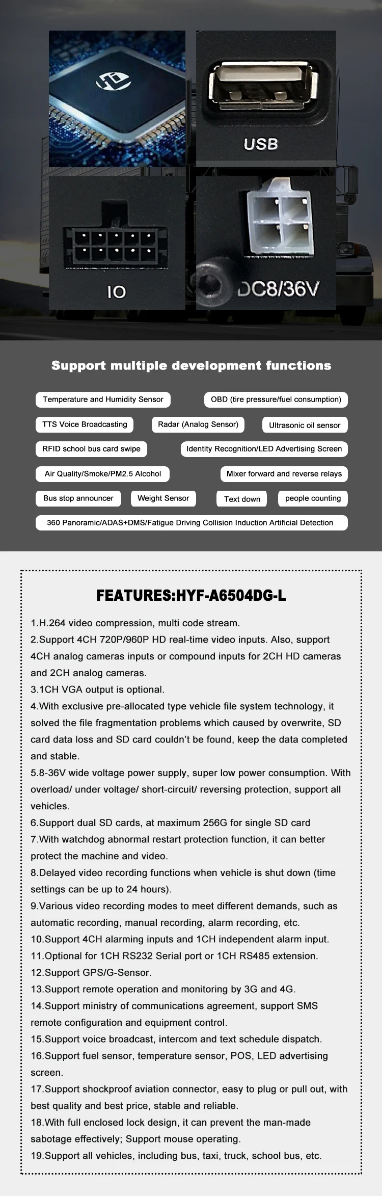 1. Оригинальный чип Haith Видеорегистратор HYF, каждый из которых использует оригинальный промышленный чип Heise, может обеспечить стабильную работу в суровой холодной и тепловой среде. 2. Гуманный интерфейс USB Гуманный дизайн, простота в эксплуатации, удобная копия информации, вставка мыши/U диска. 3. Поддержка переключения экрана Поддержка реверсивного расширения экрана, четырехполосная коммутация видео, обеспечение технической поддержки 4. Широкий дизайн напряжения Автомобильный широкополосный источник питания может стабильно работать в диапазоне напряжения DC8V-36V