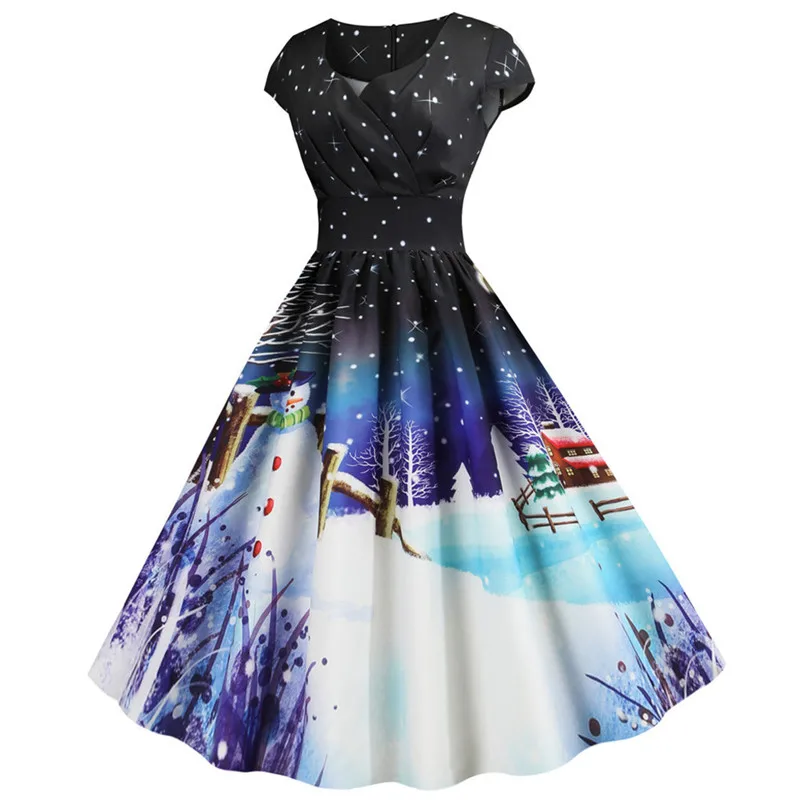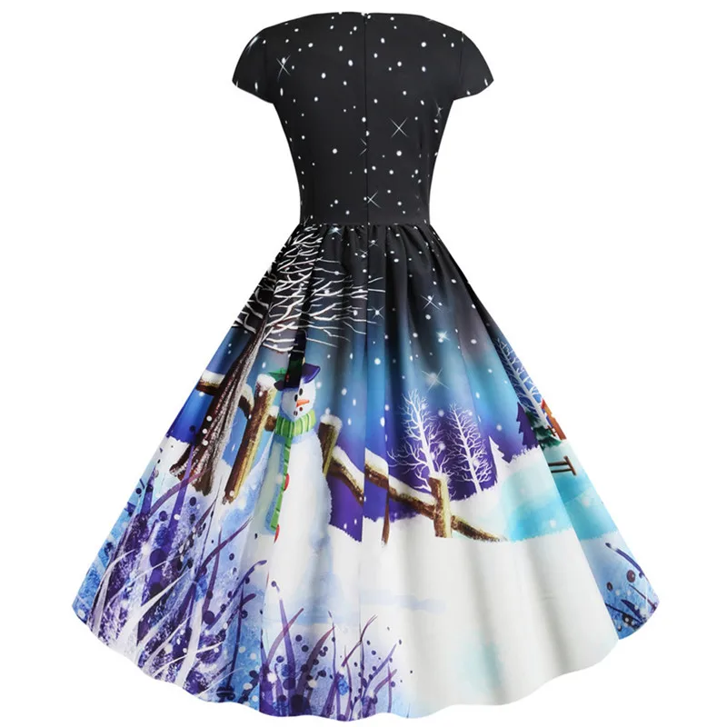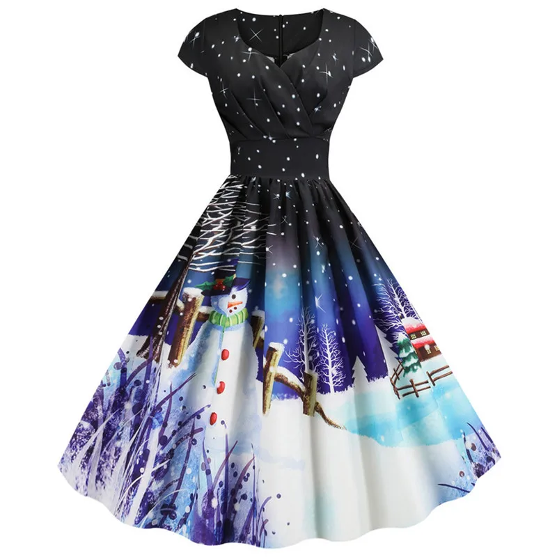 Винтажная строчка с рождественским принтом плюс Европейский королевский стиль придает вам ретро и элегантный вид; облегающий и расклешенный силуэт прикрепляет вашу фигуру