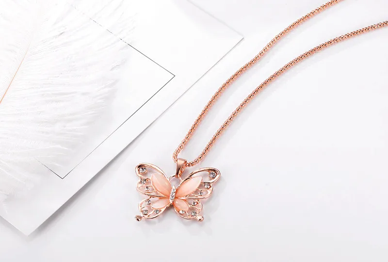 Женская цепочка-свитер с подвеской в виде бабочки из розового золота с опалом