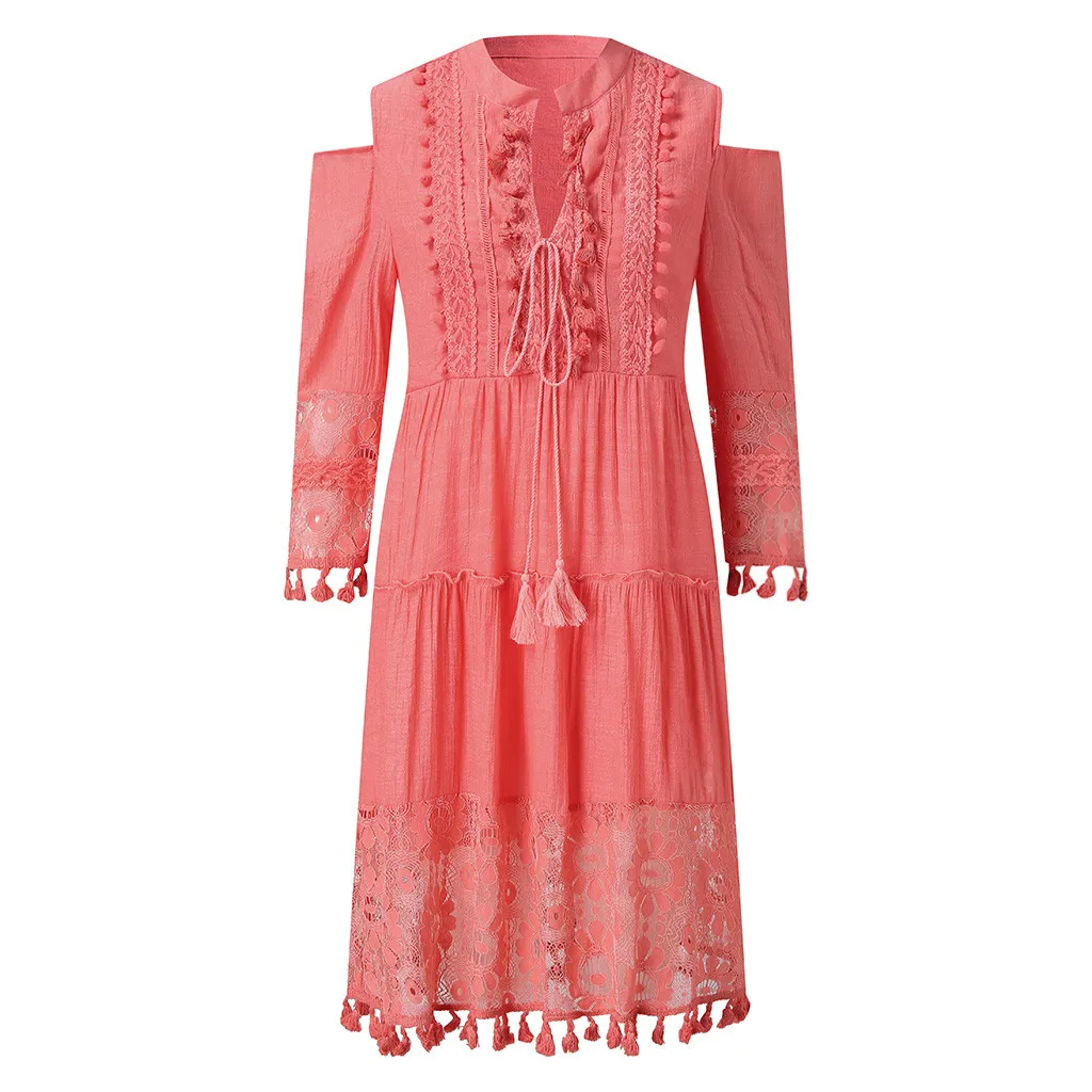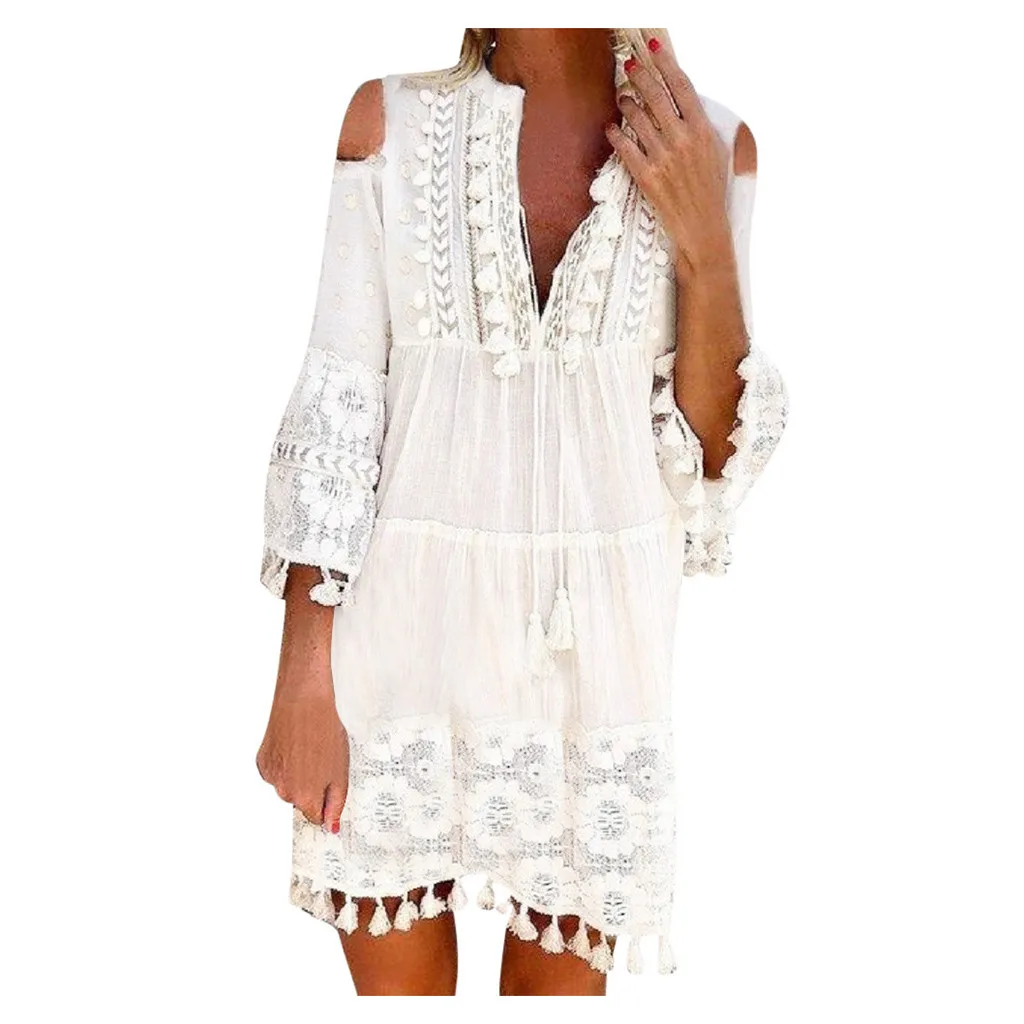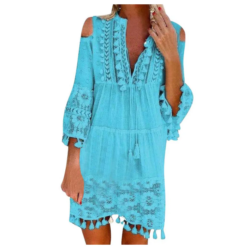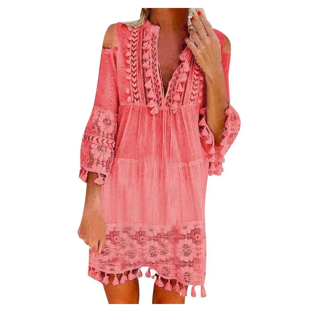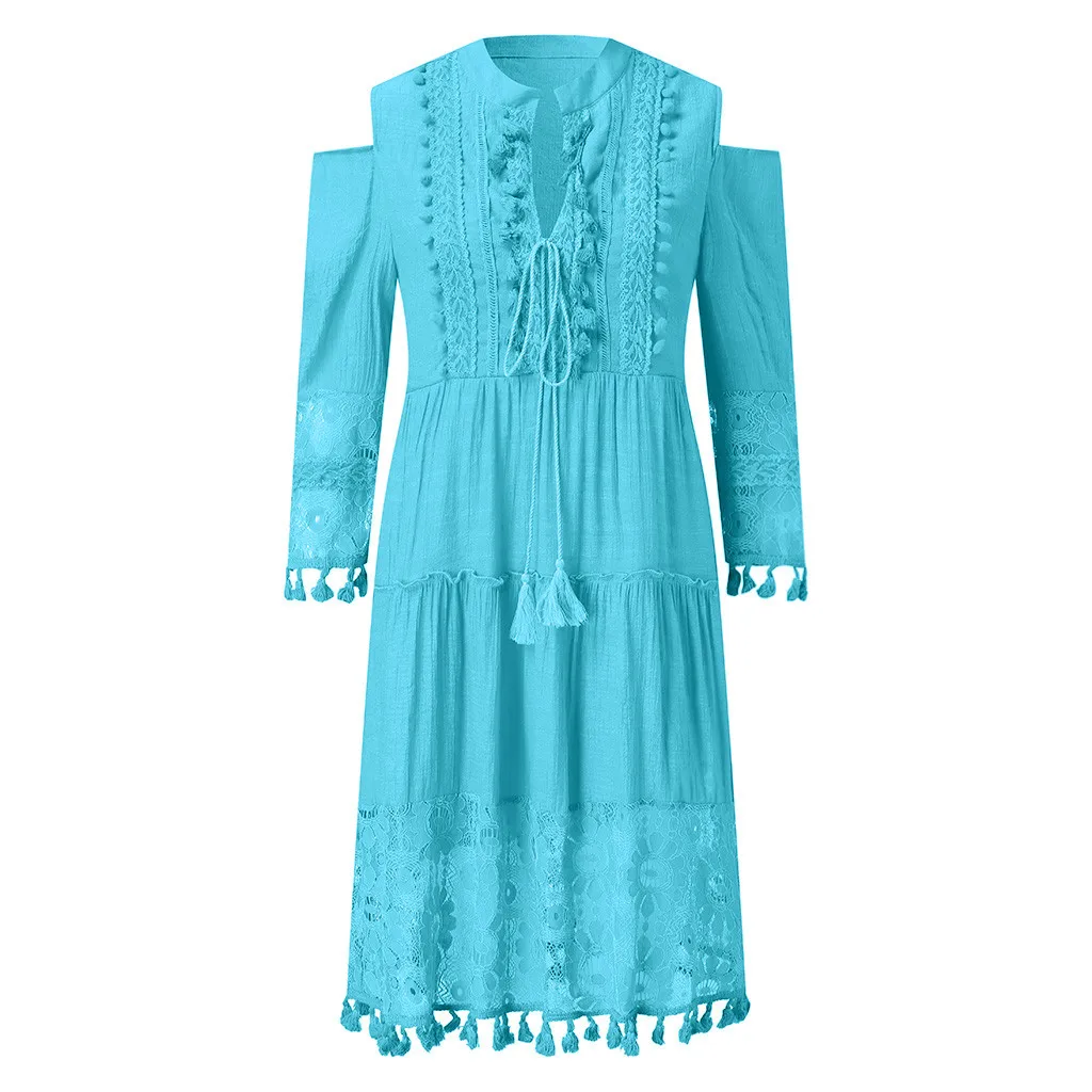 Модное повседневное богемное платье большого размера с v-образным вырезом, однотонное кружевное короткое платье с кисточками