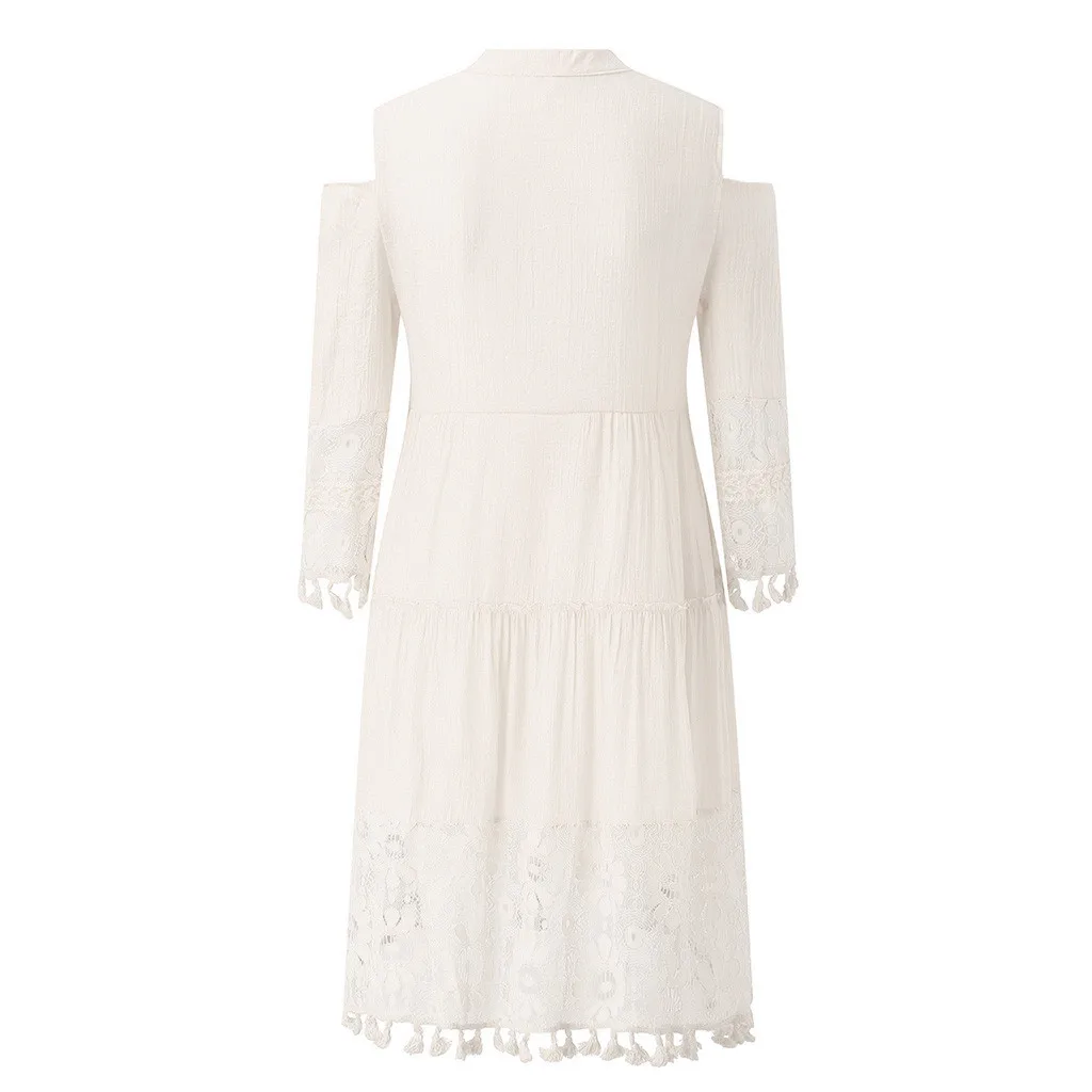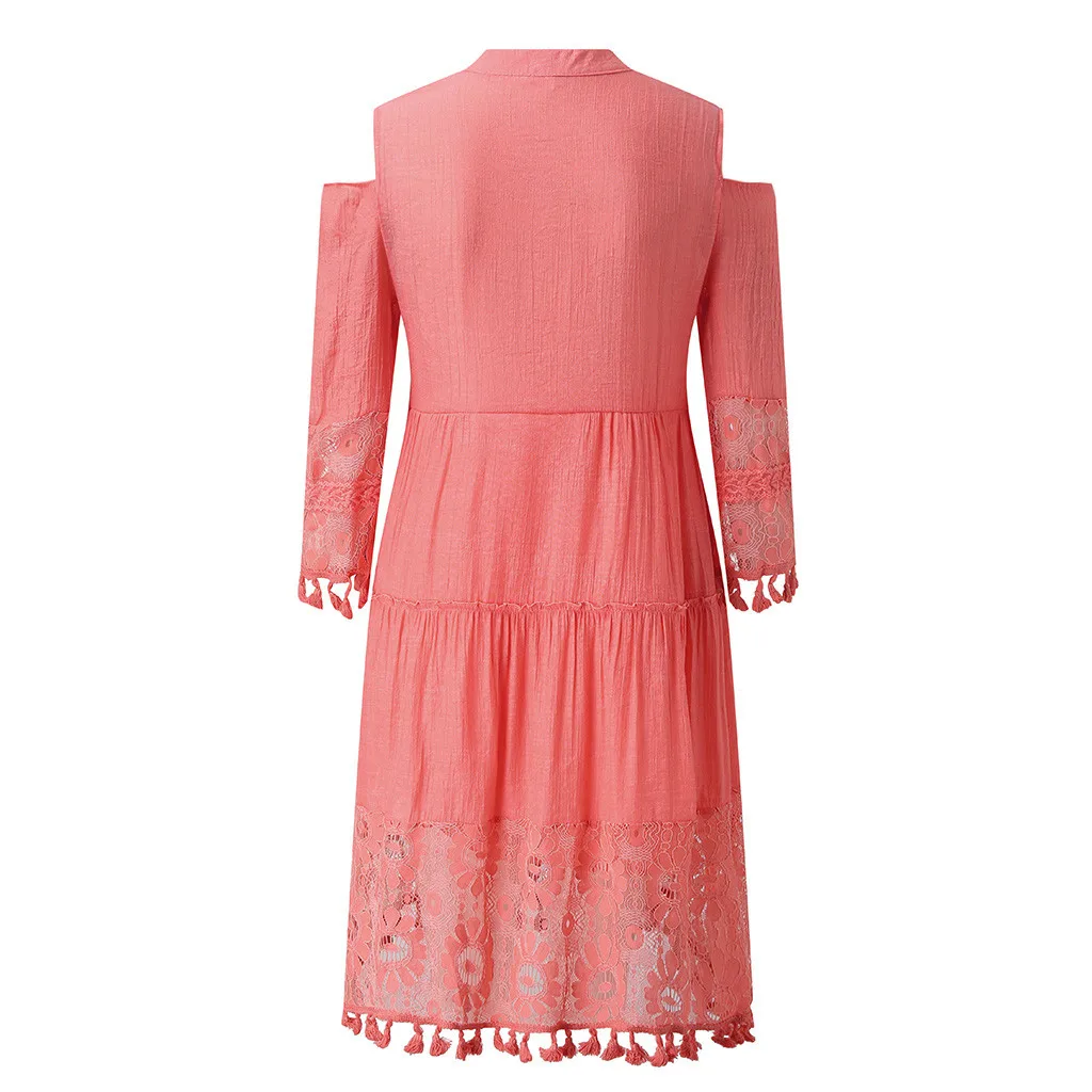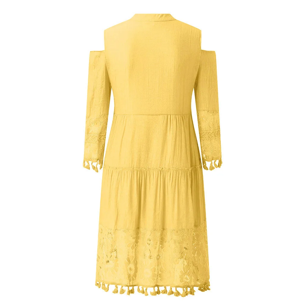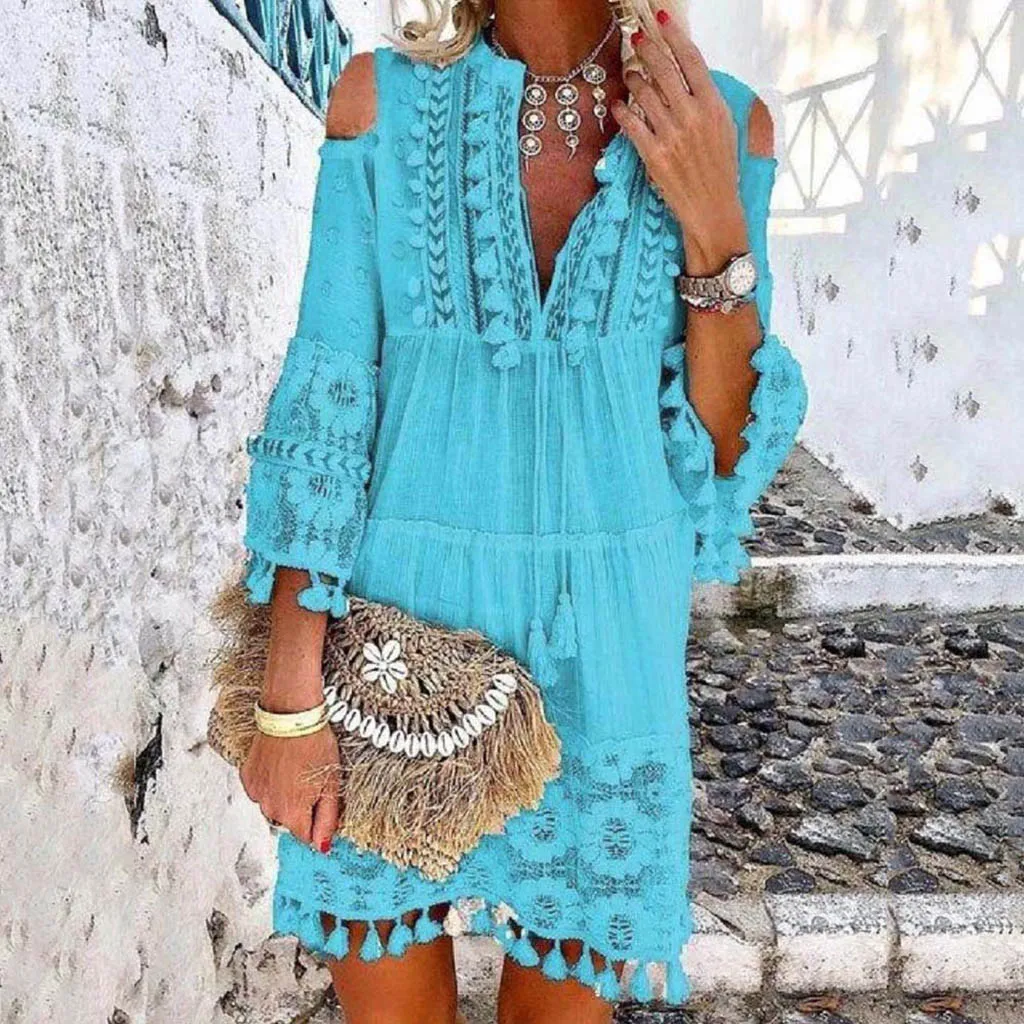 Модное повседневное богемное платье большого размера с v-образным вырезом, однотонное кружевное короткое платье с кисточками