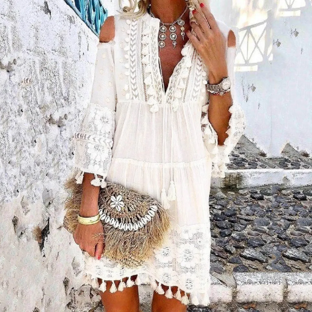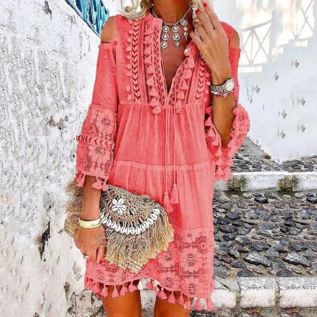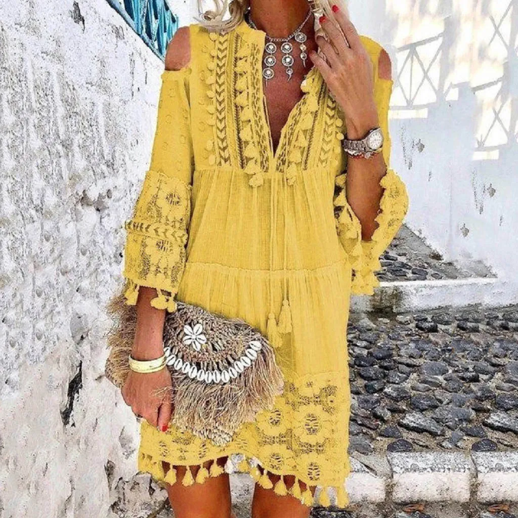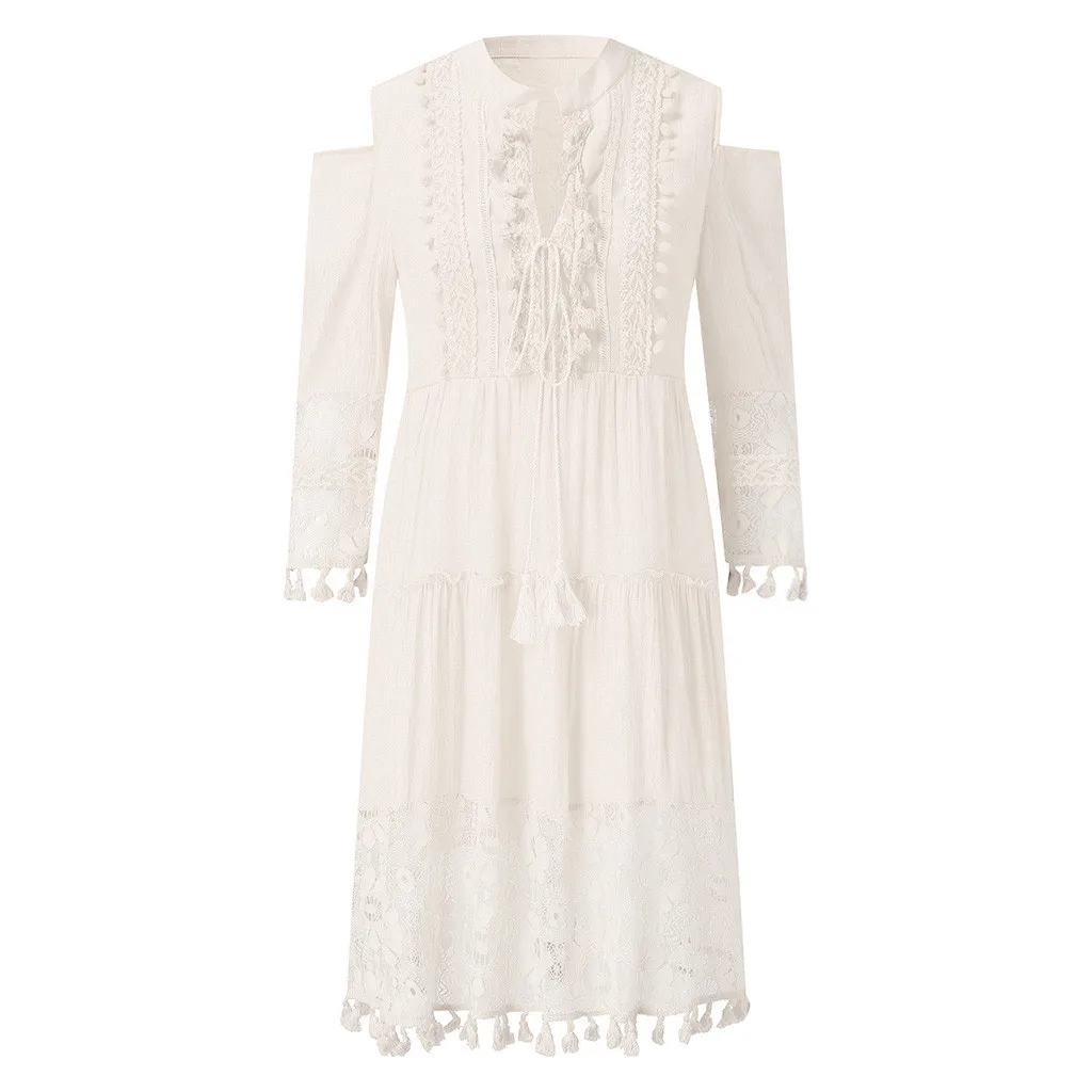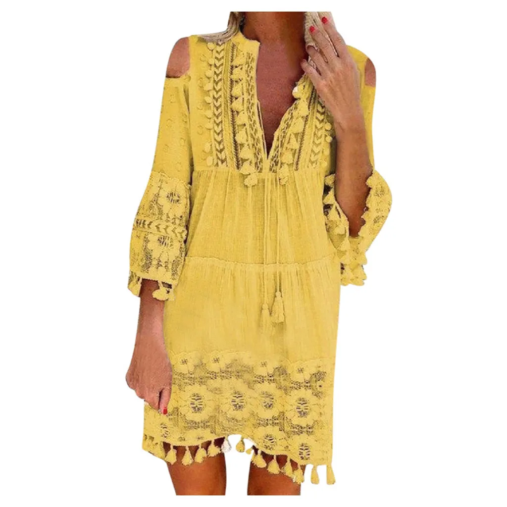 Модное повседневное богемное платье большого размера с v-образным вырезом, однотонное кружевное короткое платье с кисточками