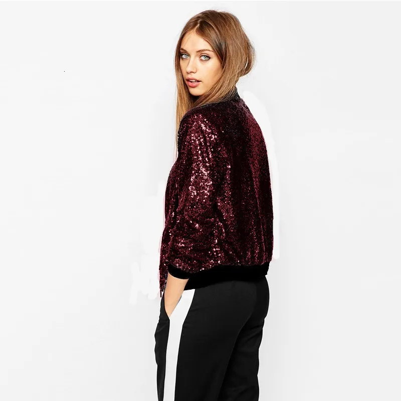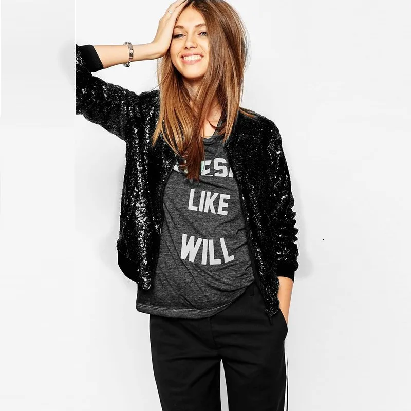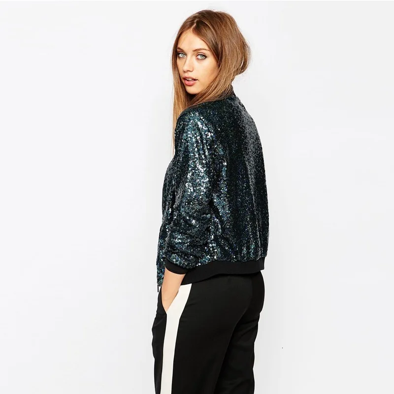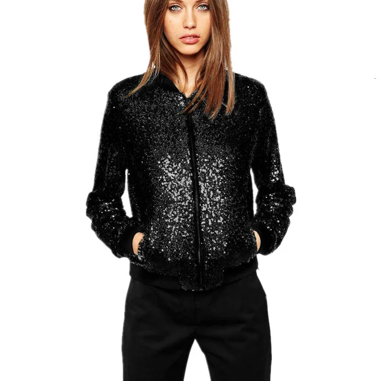 Блестящая Черная бейсбольная куртка с блестками Короткое свободное зимнее