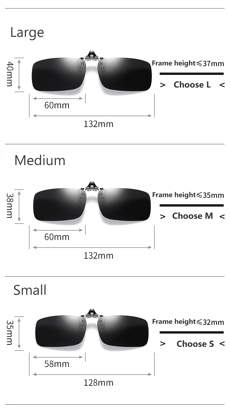 Большой: ширина: 60 мм Высота: 40 мм Общая ширина: 132 мм подходит для высоты оправы ≤ 37 мм