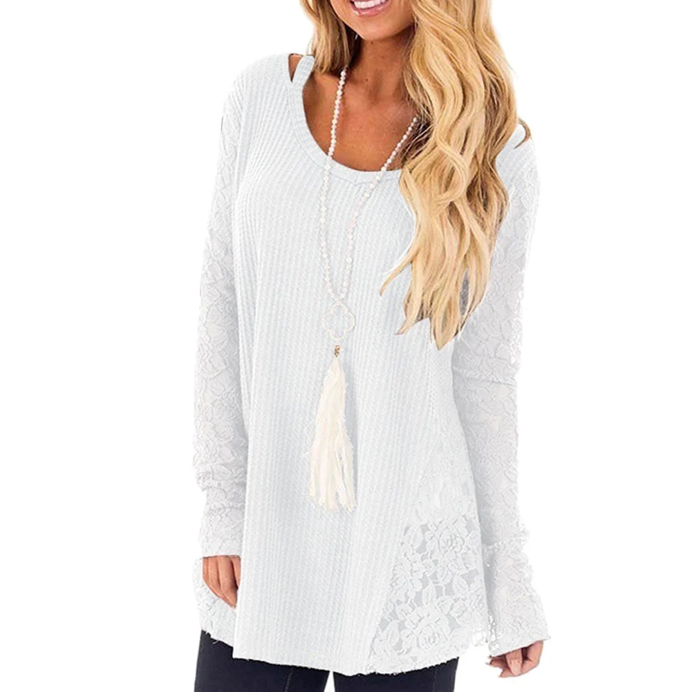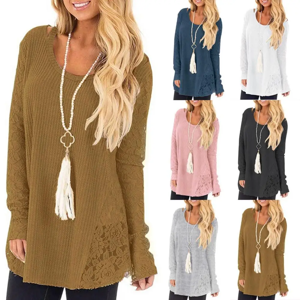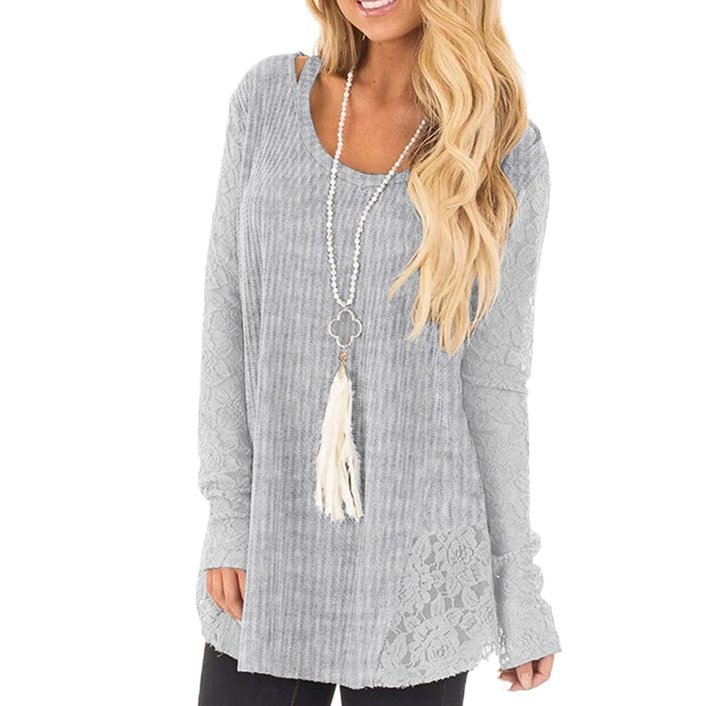 Autumn Women Loose Solid Color Lace Round Neck Long Sleeve Knitted Blouse Top
